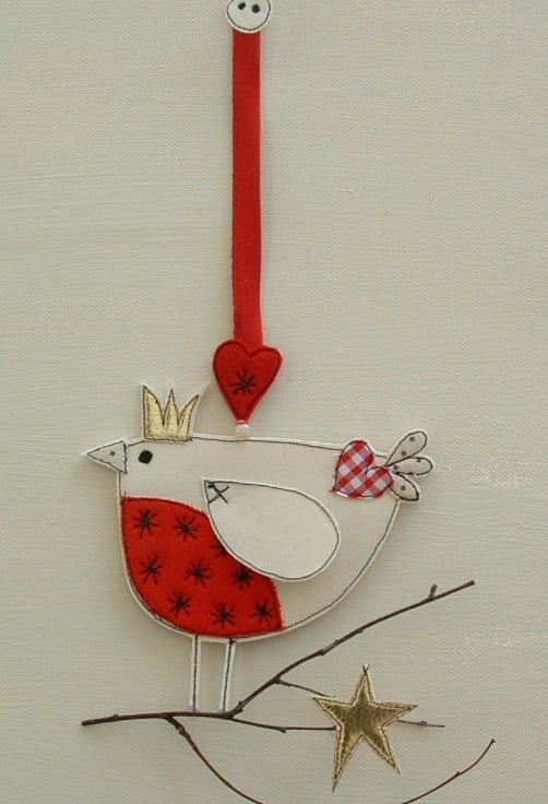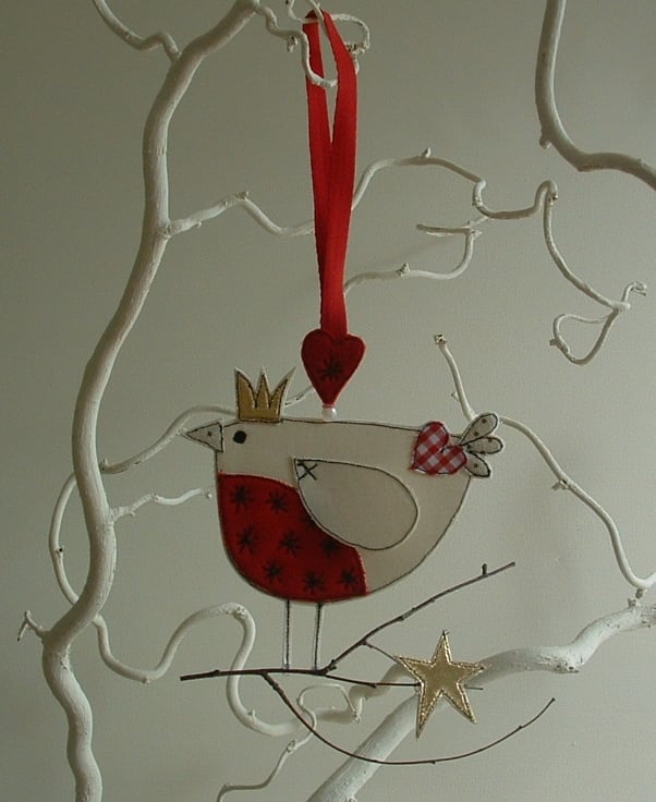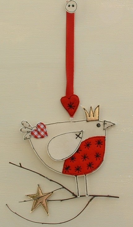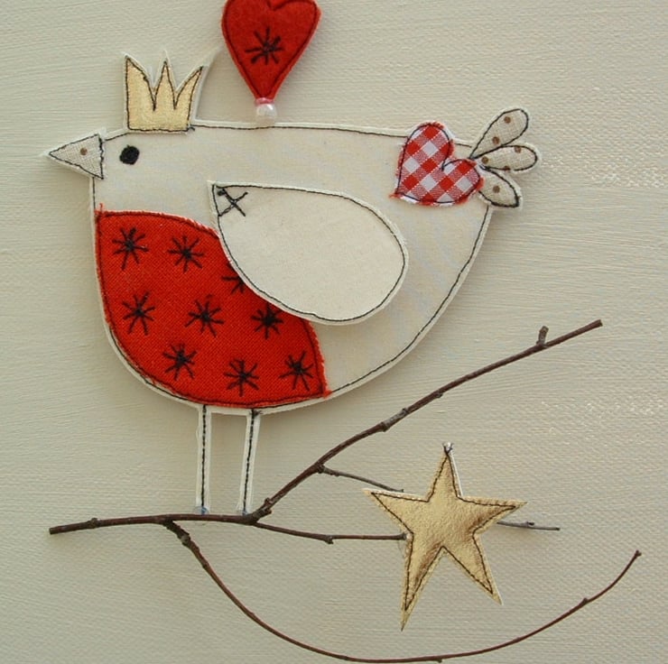 A Robin on a branch with cotton red tape hanger; Robin is about 10 cms wide, and branch is about 14 cms long. Suitable for decorative purposes only. Please note that drawing pin is not included.