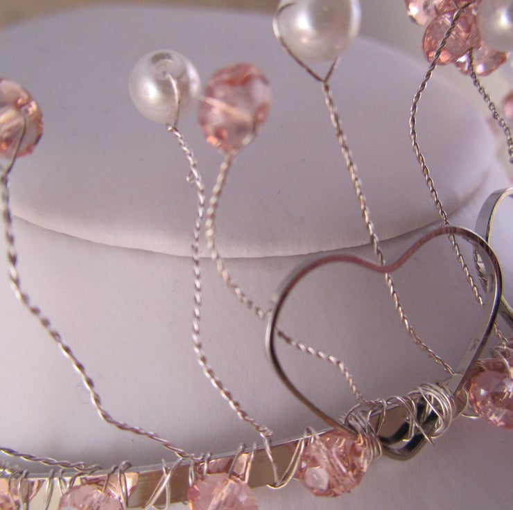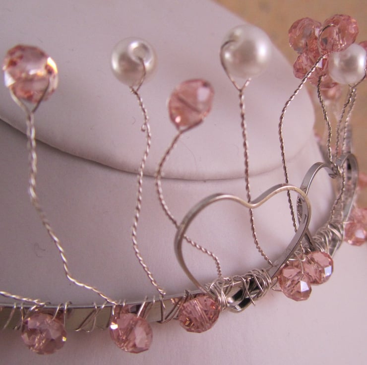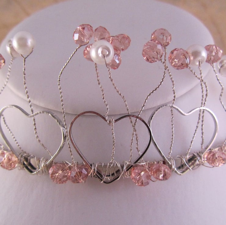 I had some lovely pink beads, so wanted to make a pretty tiara with them. The metal hearts just added something. This would be an ideal bridal or prom tiara.
