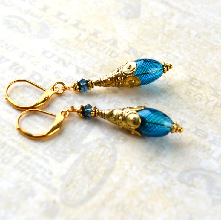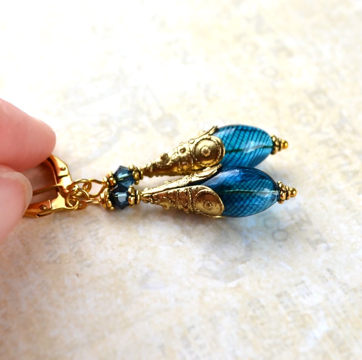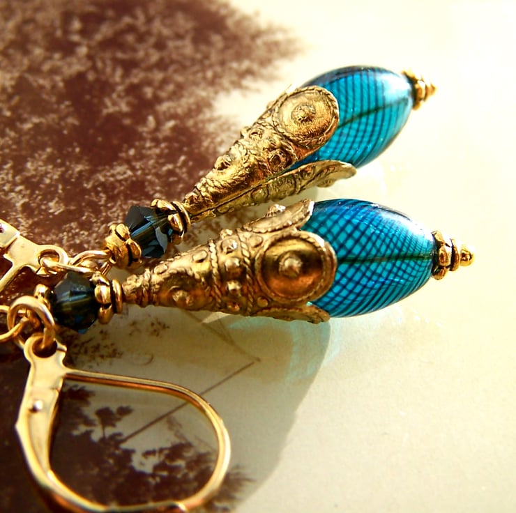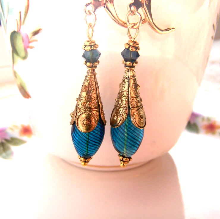 The beads are a rich shade of dark aqua blue. They have delicate swirls in dark blue encircling them. The glass beads have been accentuated by gorgeous fancy antique gold bead cones and tiny matching crystals to create a sumptuous pair of art nouveau style earrings.