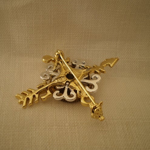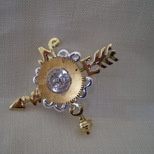 An unusual elegant Steampunk brooch with a nautical, journey theme. A delightful North, South, East and West brooch in silver and gold tone. Embellished with watch cogs and a bezel from a vintage watch. One of a kind, not to be seen elsewhere. Measures 4cms across.