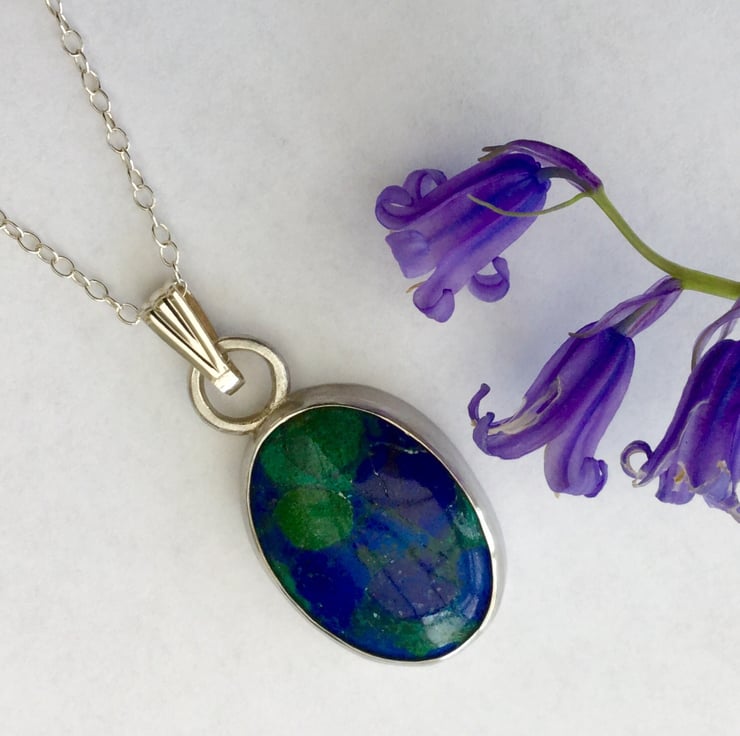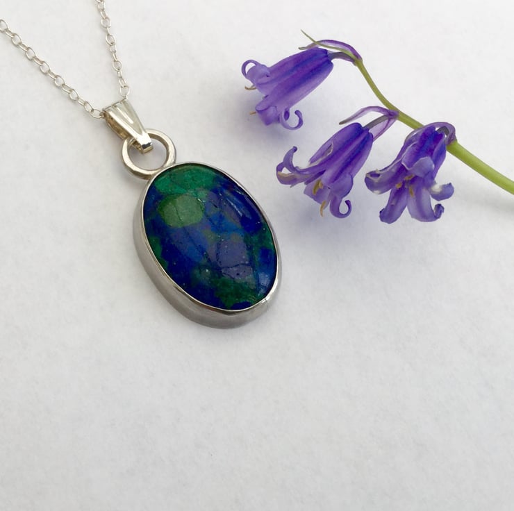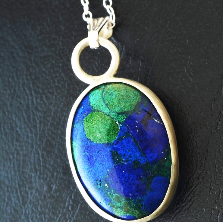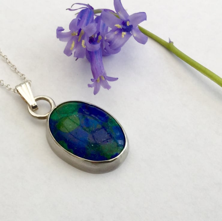 This domed oval cabochon features deep blue azurite combined with green malachite, creating a map-like impression of ocean and continents. The pendant measures 2.5 x 1.8cm. The silver setting is 6mm deep and open at the back. It has been brushed to give a satinised finish. Supplied with a 45cm (18in) sterling silver chain and bail, this item will be packaged in a smart gift box and sent by first class post.