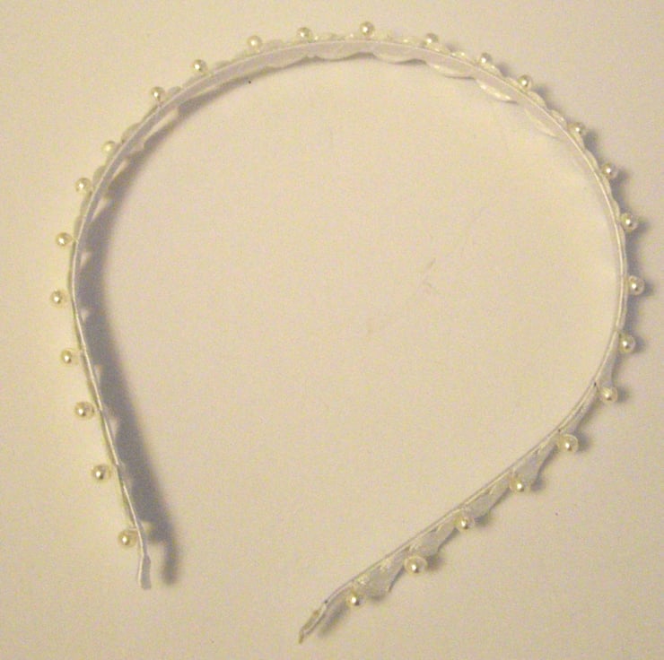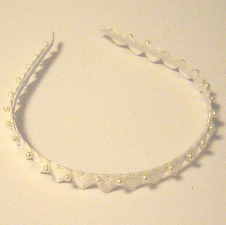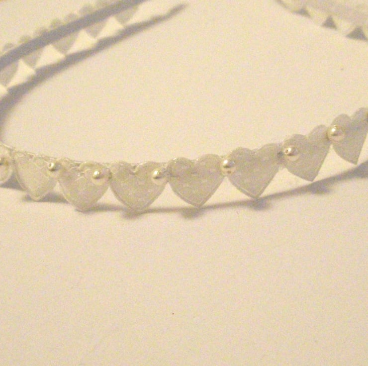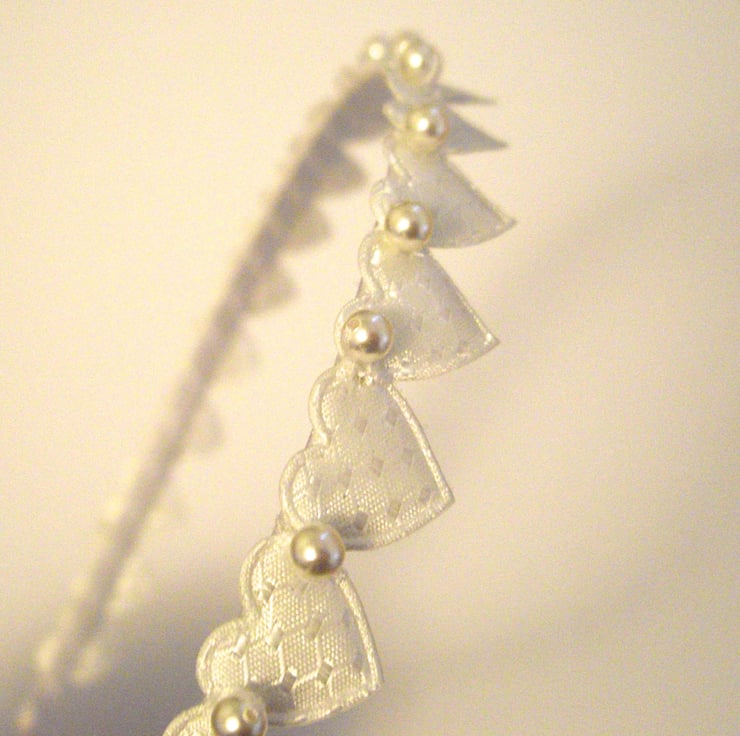 This beautiful white head band is made from a satin ribbon covered head band embelished with a slightly padded heart design ribbon with individually hand sewn Swarovski pearl beads.