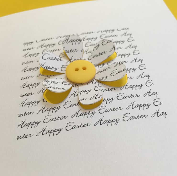 This handmade card makes a pretty and unique Easter card with a flower to remind you of spring time! The petals of the flower have been paper cut with coloured card stuck behind the folded out petals and a cute button for the centre.