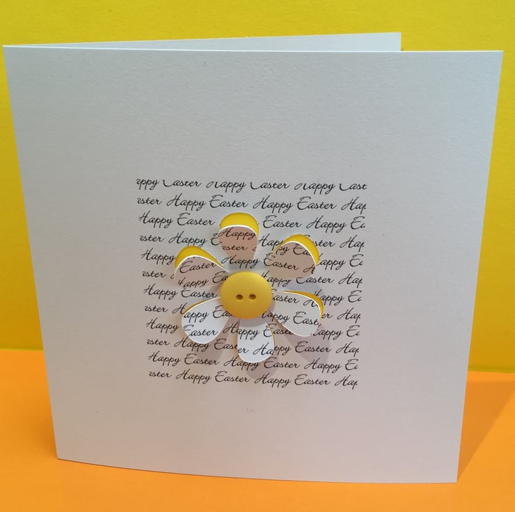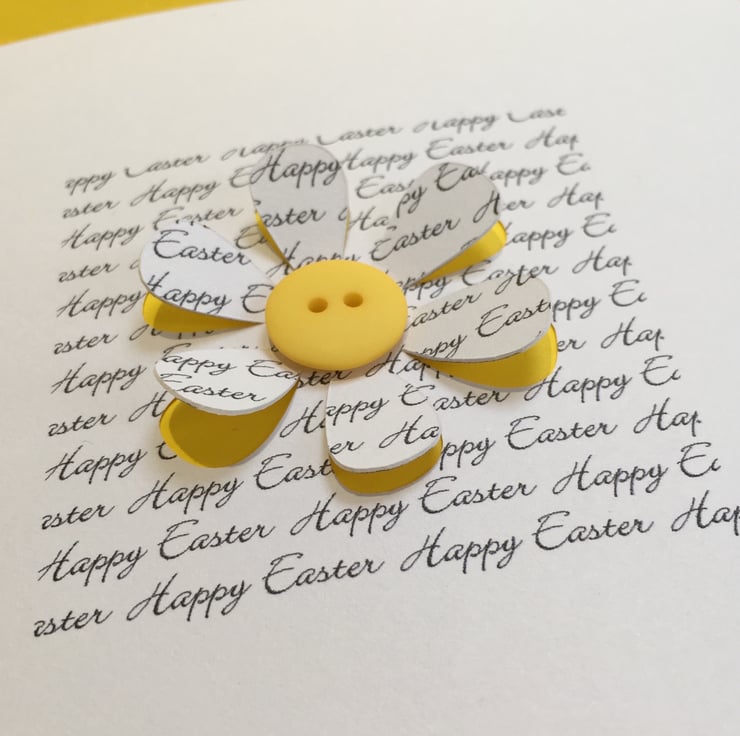 This handmade card makes a pretty and unique Easter card with a flower to remind you of spring time! The petals of the flower have been paper cut with coloured card stuck behind the folded out petals and a cute button for the centre.