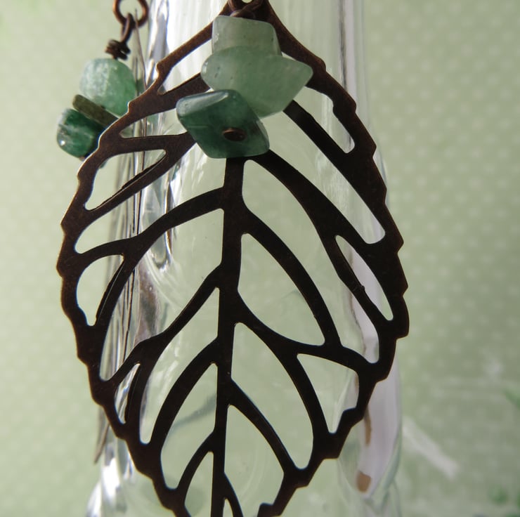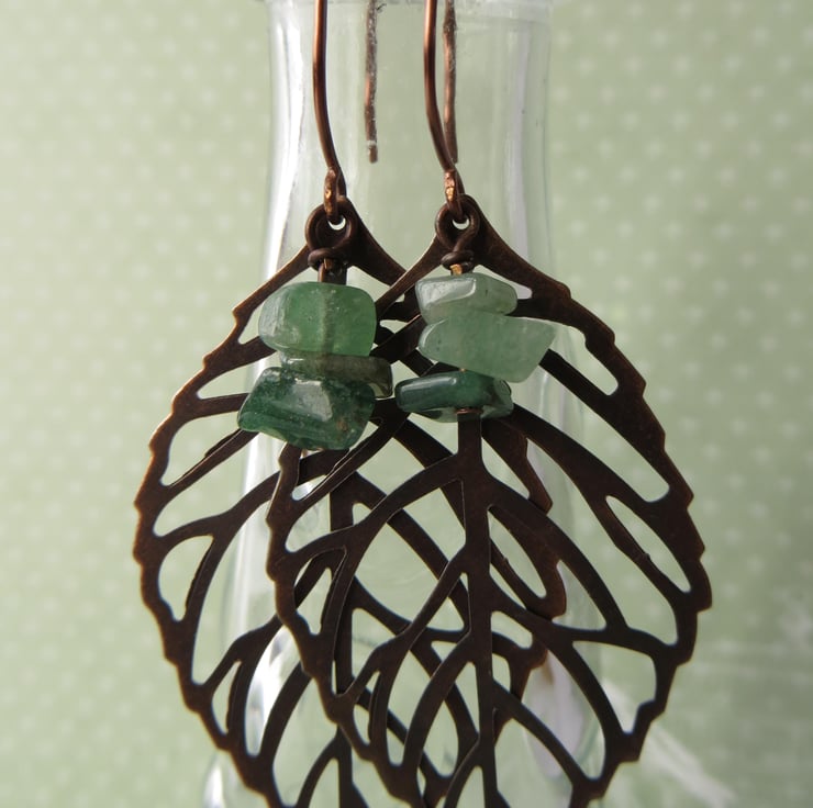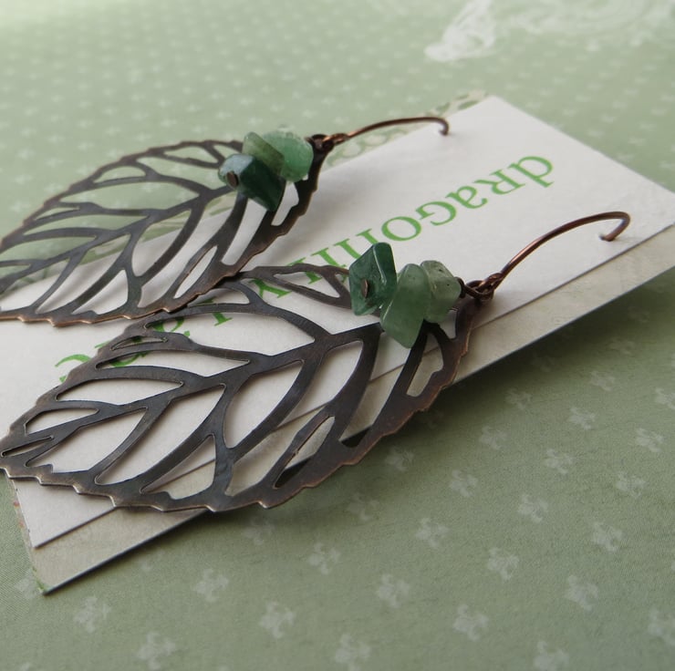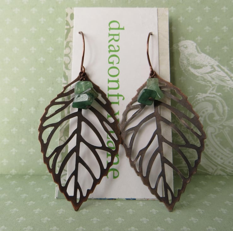 Large antique copper colour skeleton leaves topped with nuggets of green aventurine are combined in these striking earrings. The copper leaf earrings are so light you will hardly know you're wearing them!