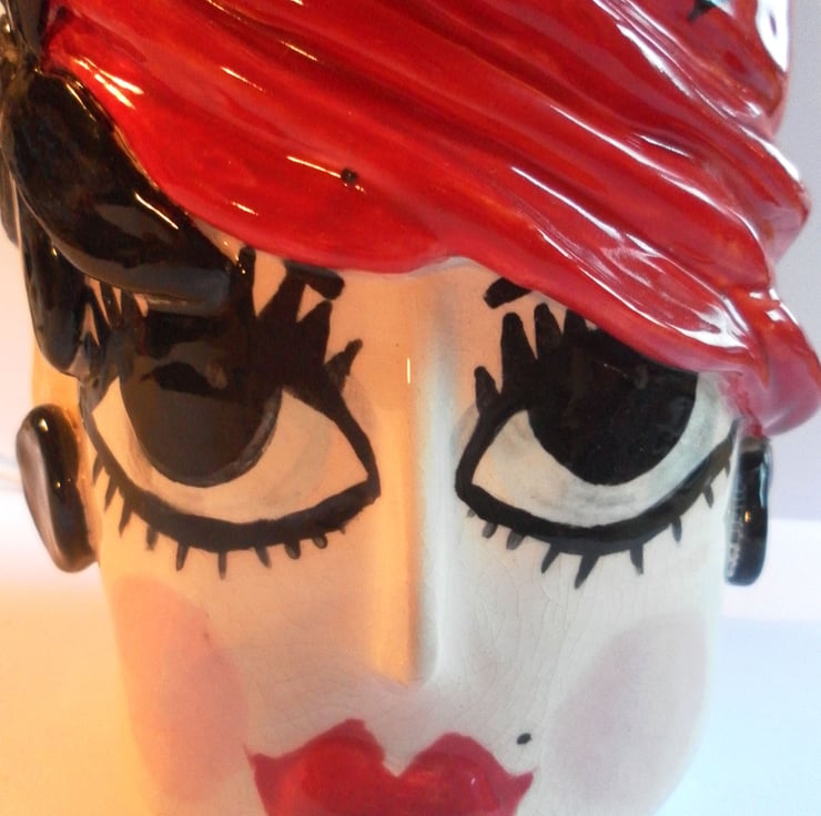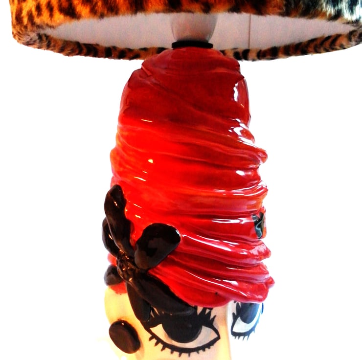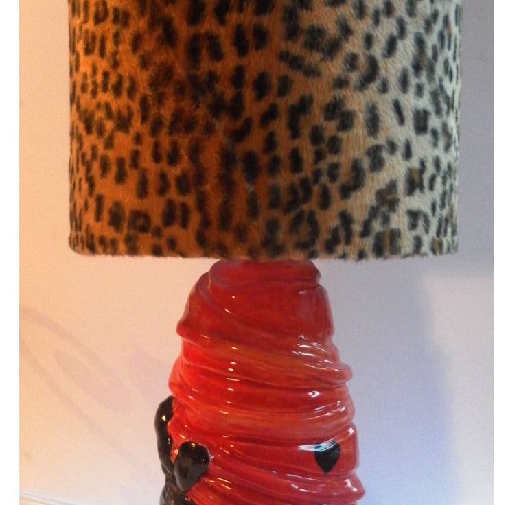 Unique handsculpted earthenware/glazed lamp base. Based upon one of Marmalademudpie's fav characters 60s Red, Normas friend the beehive gal whom loves twistin! She is 19 inches tall in total with the Bespoke handmade furry leopard print lampshade fitted.