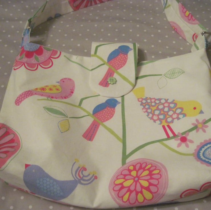 A large versatile extra wide shoulder bag made from a lovely 100% cotton Lapwing Lane fabric. A decorative bag patterned with lovely multi coloured birds ideal for the Springtime outfit. It has a multitude of uses from a trip to the park or beach or for babies nappies and bibs etc.