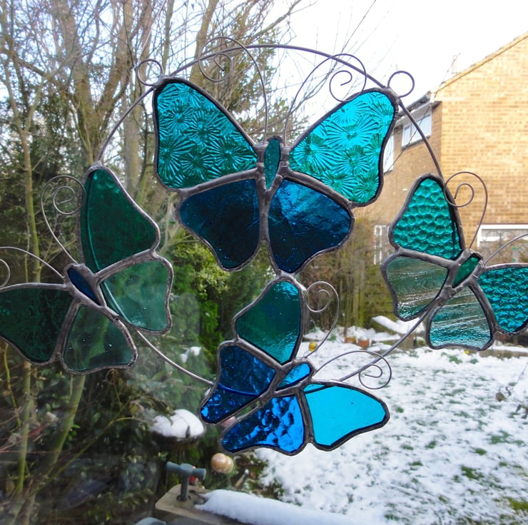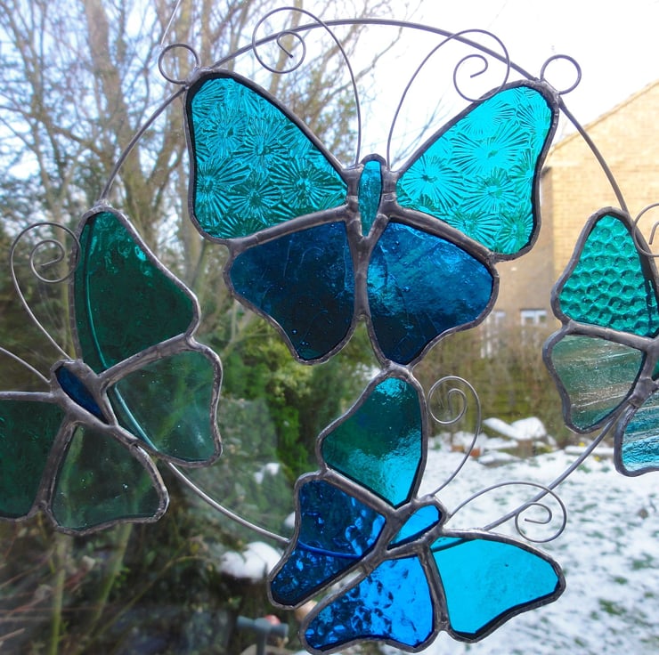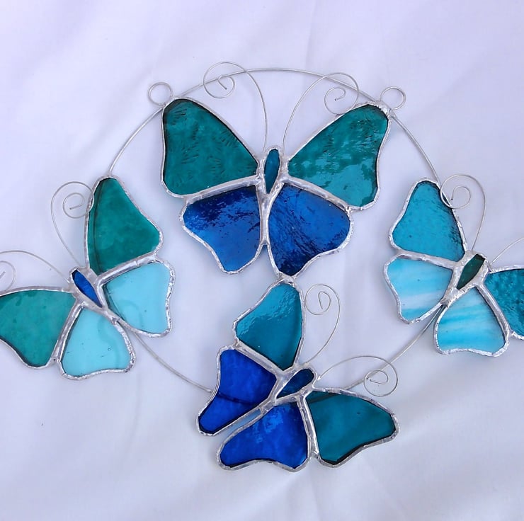 This suncatcher consists of four butterflies all made from different shades and texture of teal and turquoise glass. Each piece has been copper foiled and solder together, they have then been soldered onto a wire circle, two rings and a length of fishing line have been attached for hanging purposes.