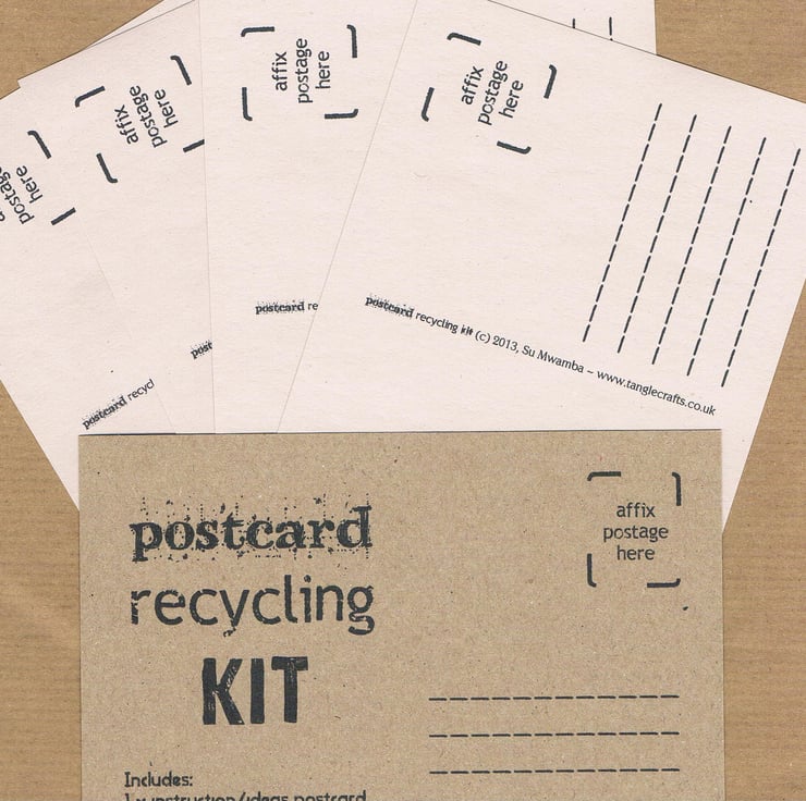 The Postcard Recycling Kit also includes 8 blank postcard recycling labels, so that you can upcycle any piece of flat artwork, photography, or waste cardstock as a postcard. (Only 4 are shown in photo, but you will receive 8.) Why buy postcards when you can upcycle your own, instead?