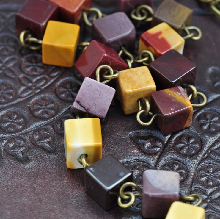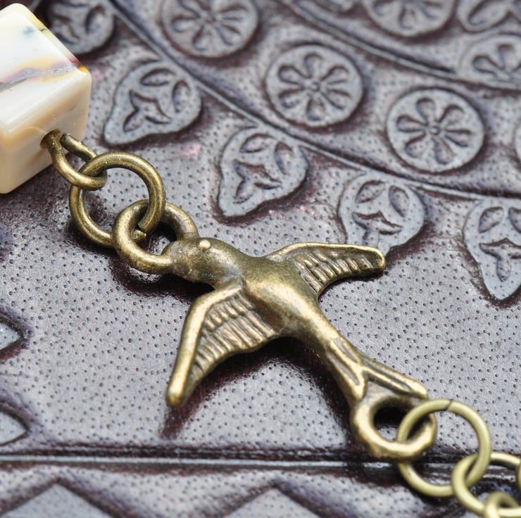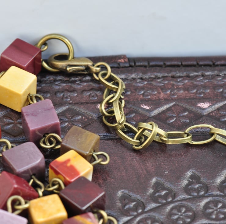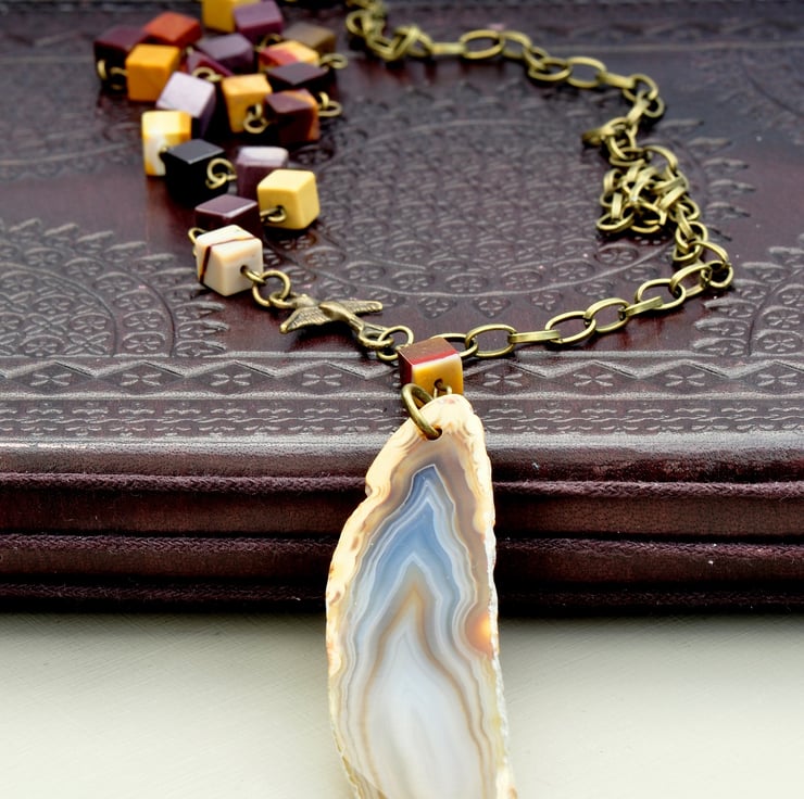A stunning Agate Slice pendant with tones of orange, cream, grey and beige adornes this piece which has a beaded strand of Mookaite gemstone cube beads in shades of purple, orange, yellow and mustard with a little antique bronze plated bird connector to add to the charm of the necklace and the other strand is of antique bronze plated chain, finished with a trigger clasp.