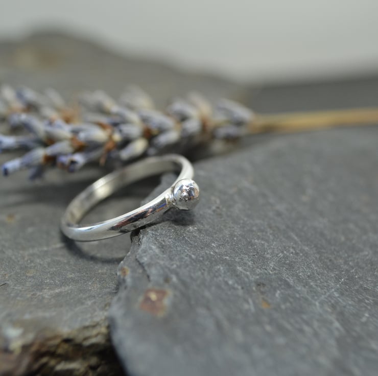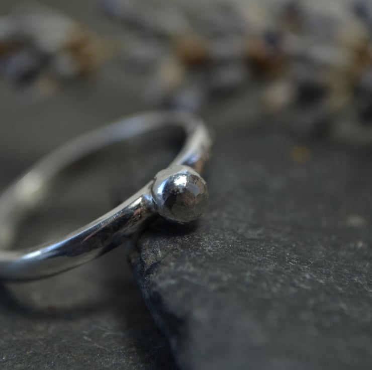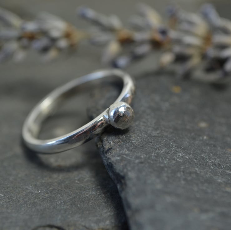 This ring features a "dot" of recycled silver - made by melting it into a ball. This can give the dot a slightly rustic texture, and no two will ever be the same. I can either leave this smooth (pic 2) which is the standard finish or hammer to give a slightly faceted appearance (pic 1 and 3). Let me know if you would like the hammered effect in the note to seller at checkout. The ring is then tumble polished to give a gorgeous high shine.