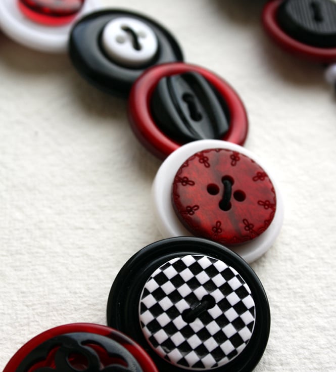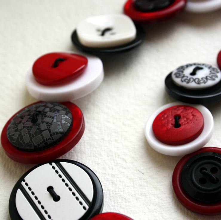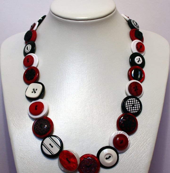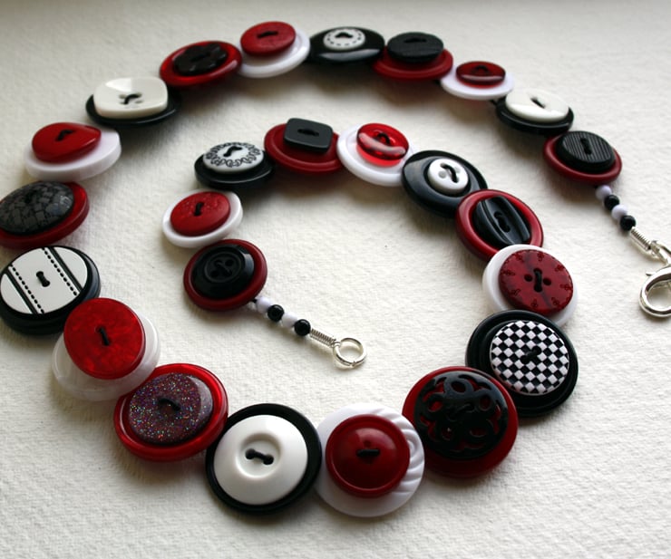 This distinctive button necklace is rich with an assortment of red, black and white buttons.