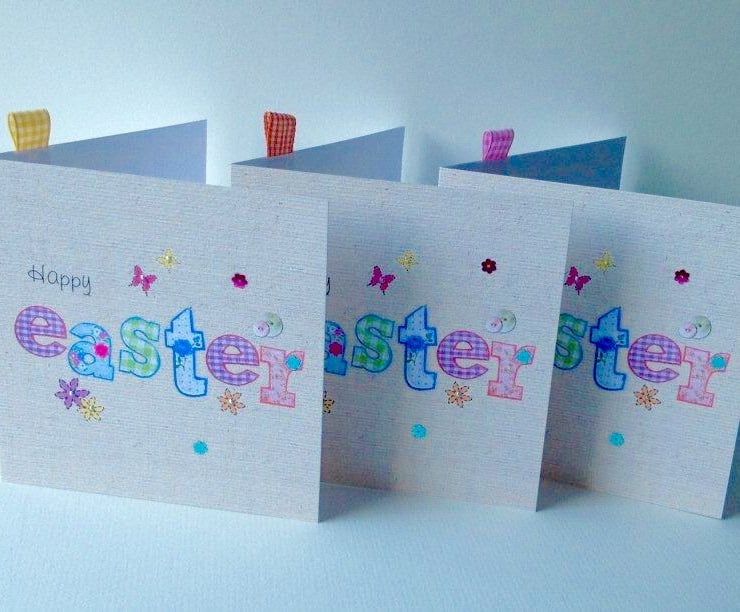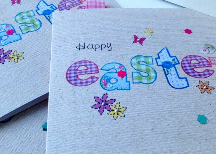The printed background is a linen effect in a natural colour, the word Easter is made up of digital embellishments, I have then handfinished the cards using the odd sequin flower and some pearl paint drops.