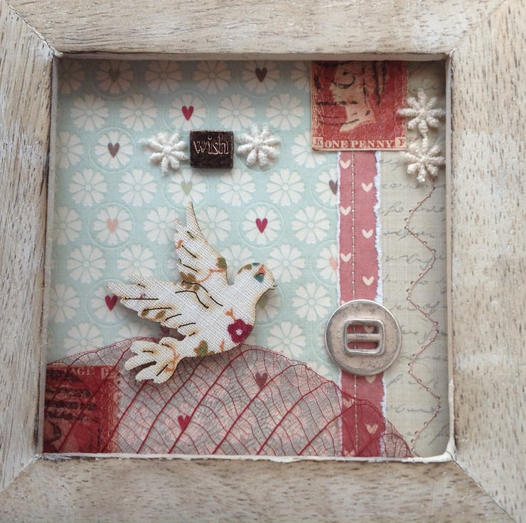 Collage in duck egg and a vintage salmon pink. Penny red stamps add a vintage feel and Delightful dove and 'wish' charm make this collage a must have for your special space.