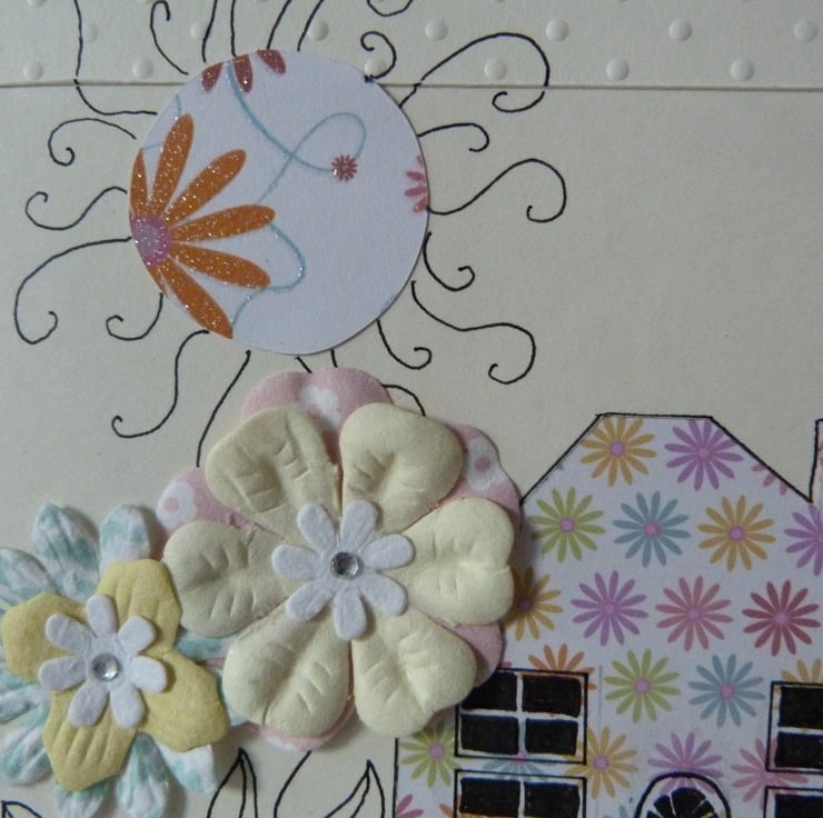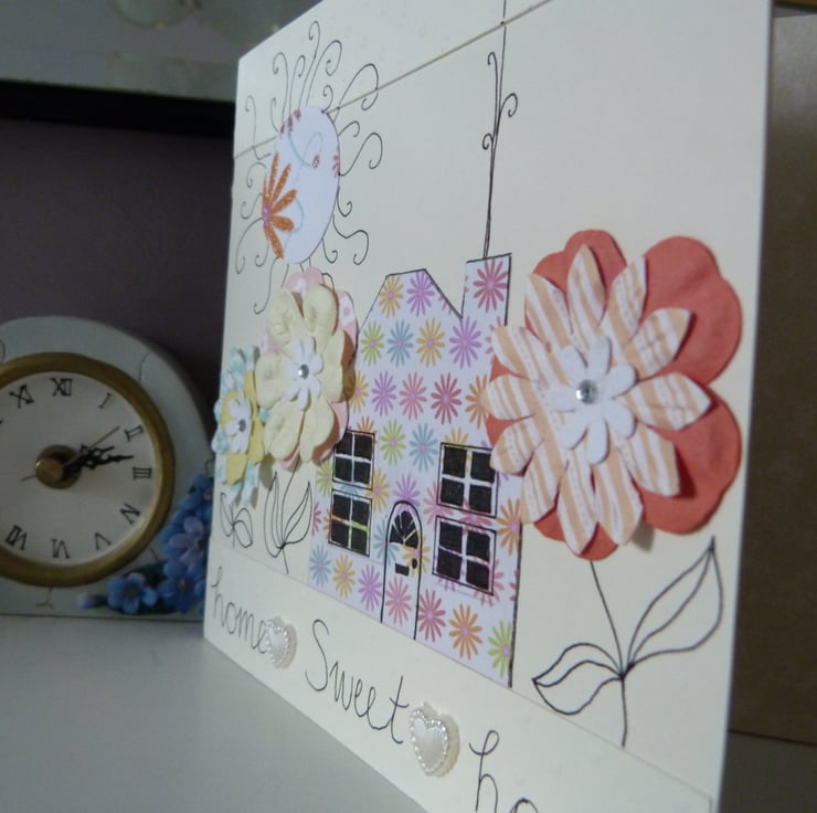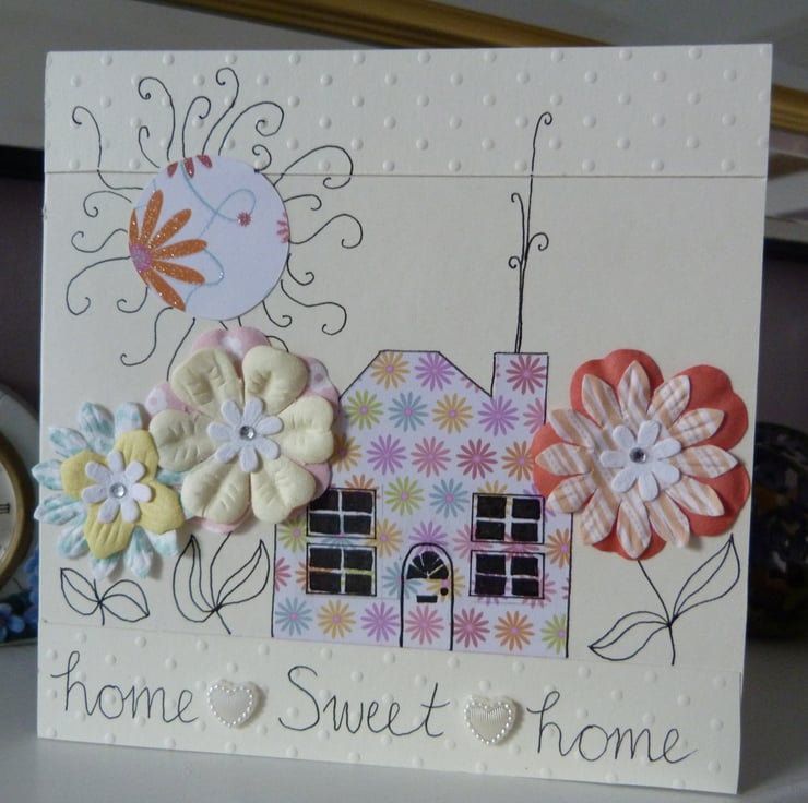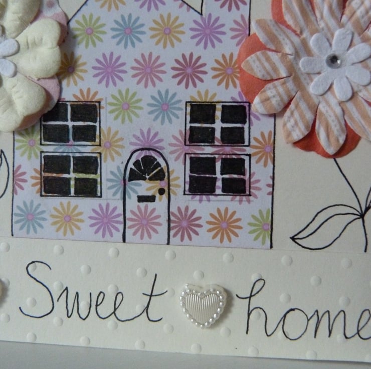 A pretty house hand cut from floral paper, mounted onto quality cream card. The top and bottom of the card has a strip of dotty embossed cream card. Embellished with a floral glittered sun, 3 paper flowers. the words home, sweet home hand drawn in pen and ink, with 2 white pearl plastic hearts.