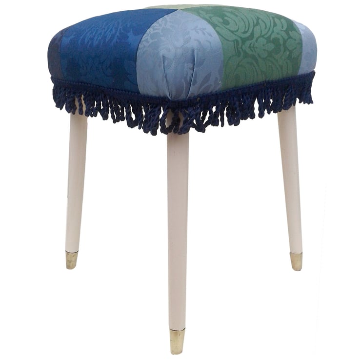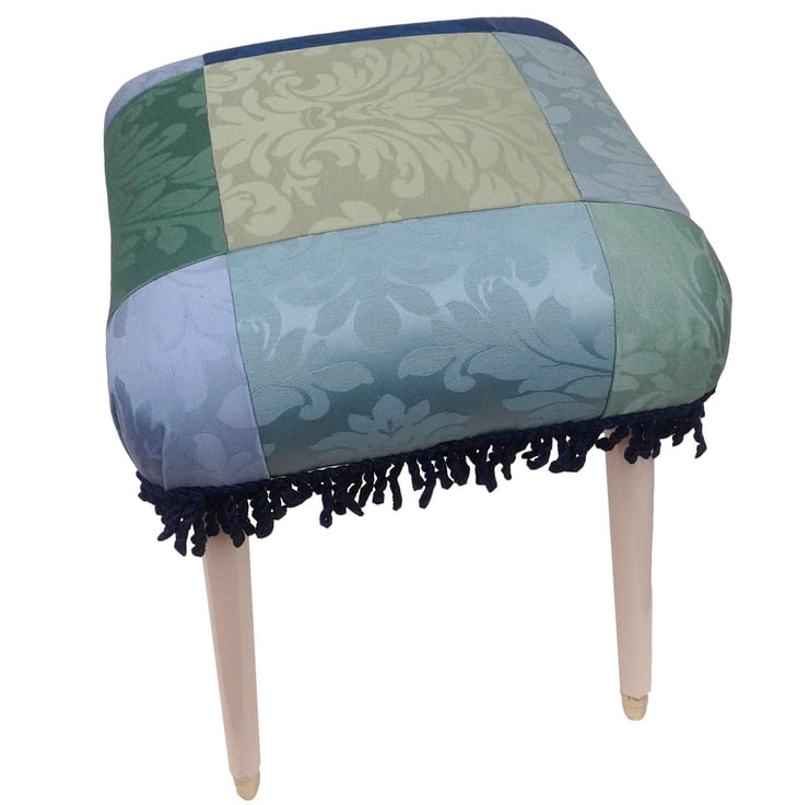 This elegant footstool has been upholstered using quality fabric with a damask pattern in colourful green and blue squares. With a navy fringing and brass plated feet it combines tradition and vintage to add a stylish and unique piece to your home. The footstool was bought second-hand and then re-upholstered, as such is a complete one-off.