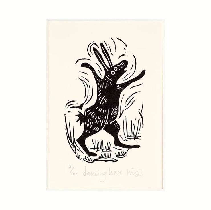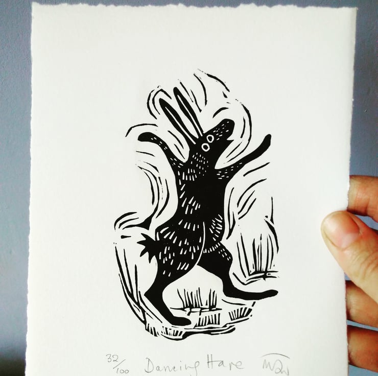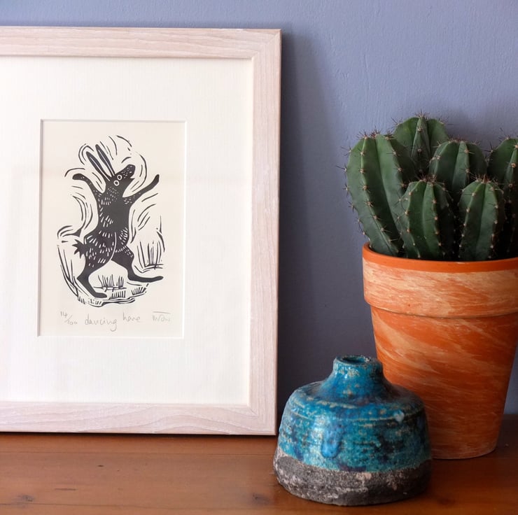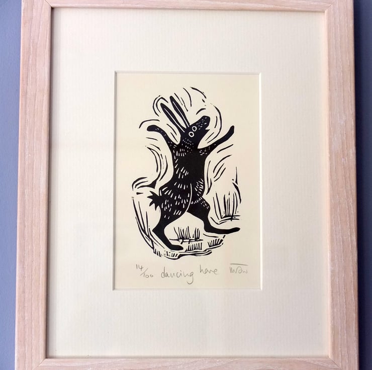 The image size is 8cm high by 13 cm wide. The listing is for an unframed print which will be supplied wrapped in plant based wrap and backed with card ready to frame or give as a gift to a hare loving friend.