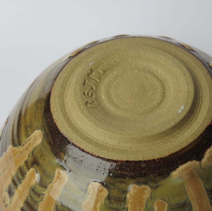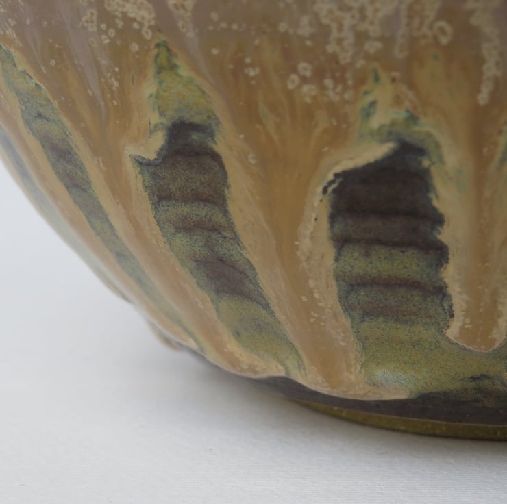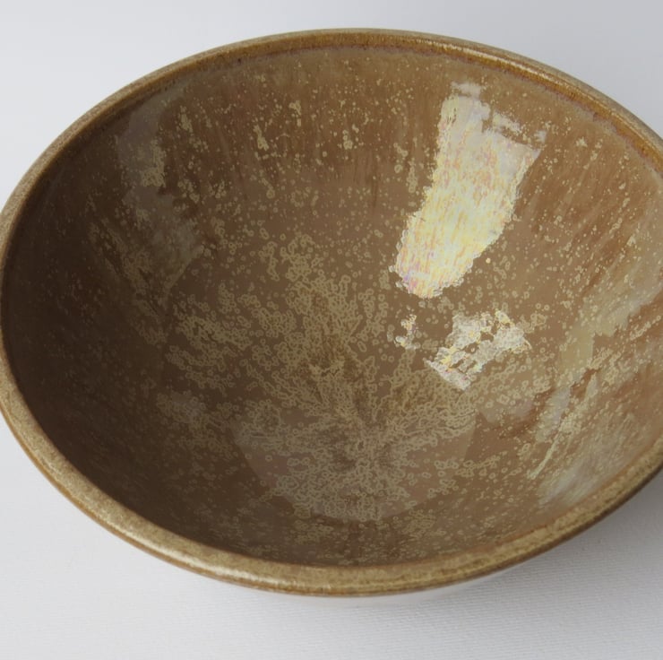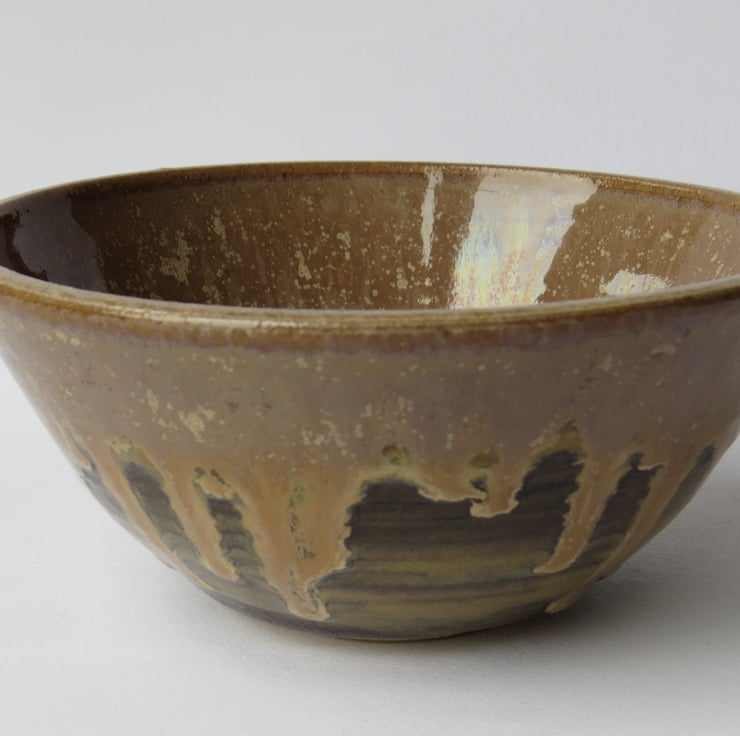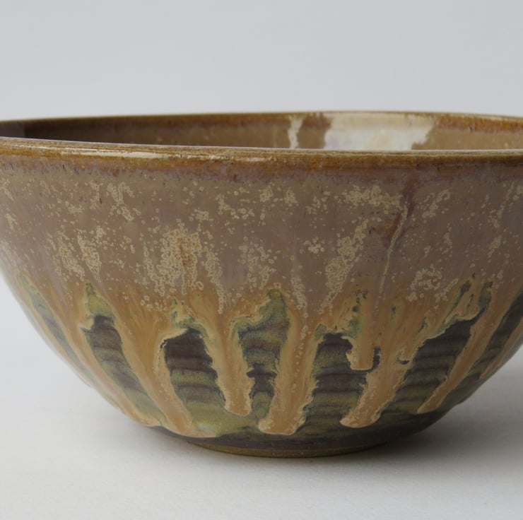 The glazes have reacted and moved so wonderful together on this bowl that it has a very delicate but fluid feel to it. The inside of the bowl is a predominantly a glossy milky coffee colour with small crystal formations developed as the glaze cooled. The outside of the bowl was glazed with a chocolate brown and yellowy cream and has the wonderful coffee glaze running down the sides into it.