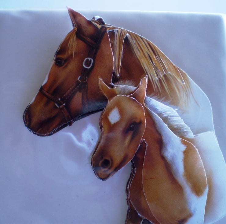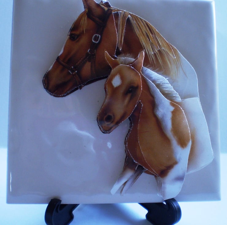 I have put a decoupage horse and foal on a cream tile,10cx10cm (4x4in) and can personalise it with any name,just let me know. It comes with a black stand and a white box with a gold tie.