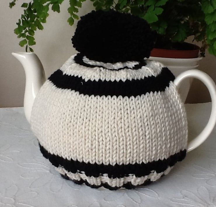 My new Tea Cosy range has arrived with this stripe black and cream cosy with bobble. Designed to fit up to and including a 6 cup pot. It is made from a wool/acrylic mix, this allows it to be machine washed, and tumble dried on a cool seting, though, I would generally recommend handwashing to keep it better in a better shape.