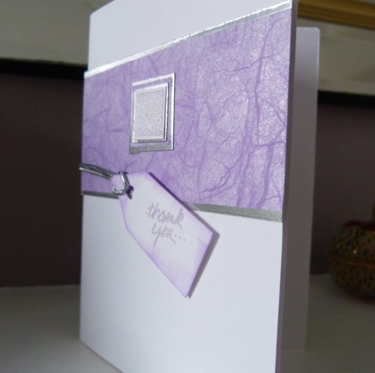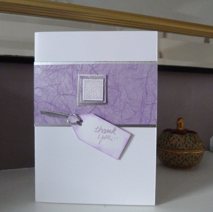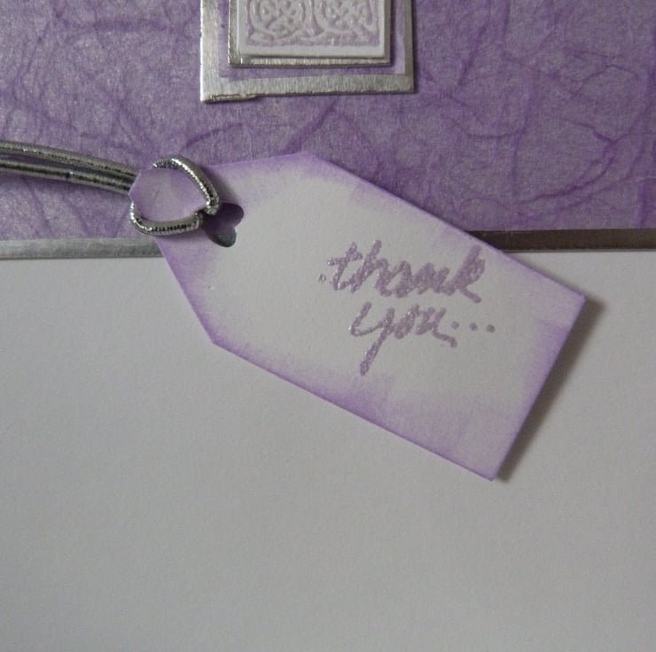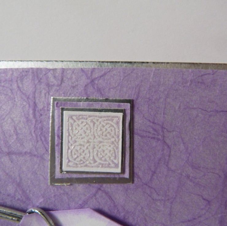 A celtic design stamped and embossed in lilac mounted onto purple handmade paper, mounted again onto silver card and then onto a strip of purple handmade paper. Again mounted onto silver card and then onto quality white card. Finished off with a thank you tag with silver rope cord.