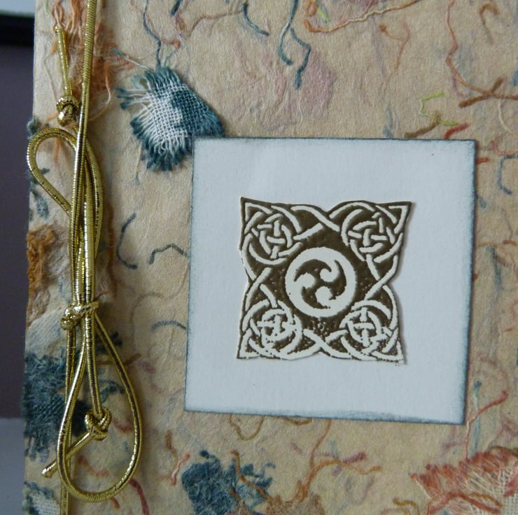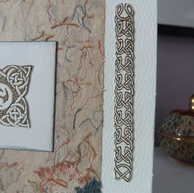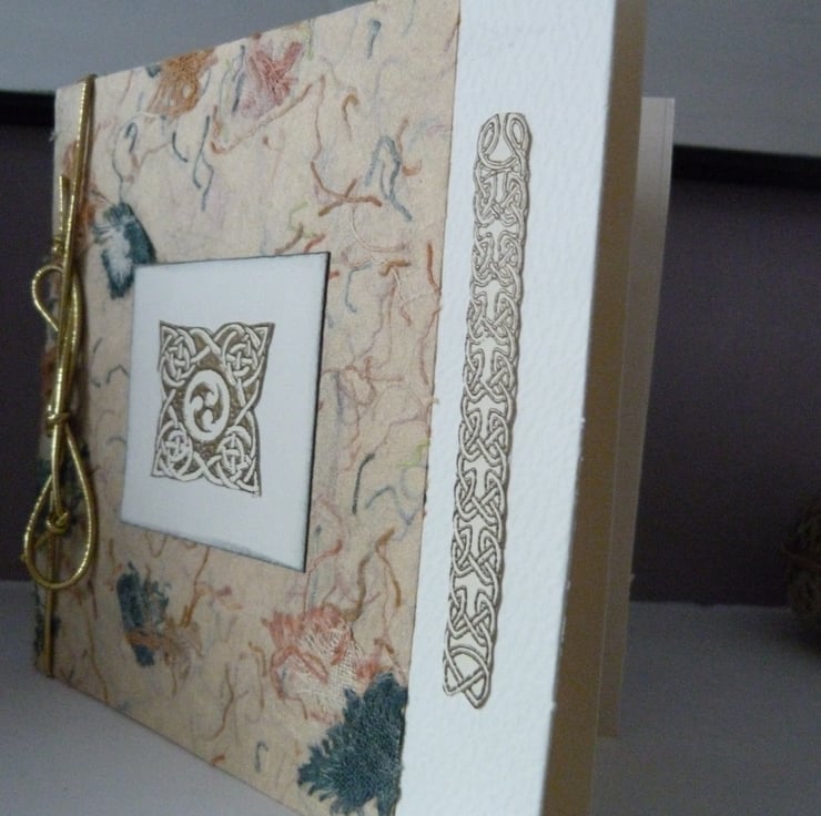 A traditional celtic design stamped and embossed in gold mounted onto cream card. Mounted again onto an apricot coloured hand made silk paper. The edge of the card further decorated with a stamped and embossed row of celtic knots. Finished off with gold rope cord and bow.