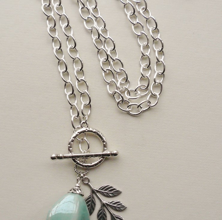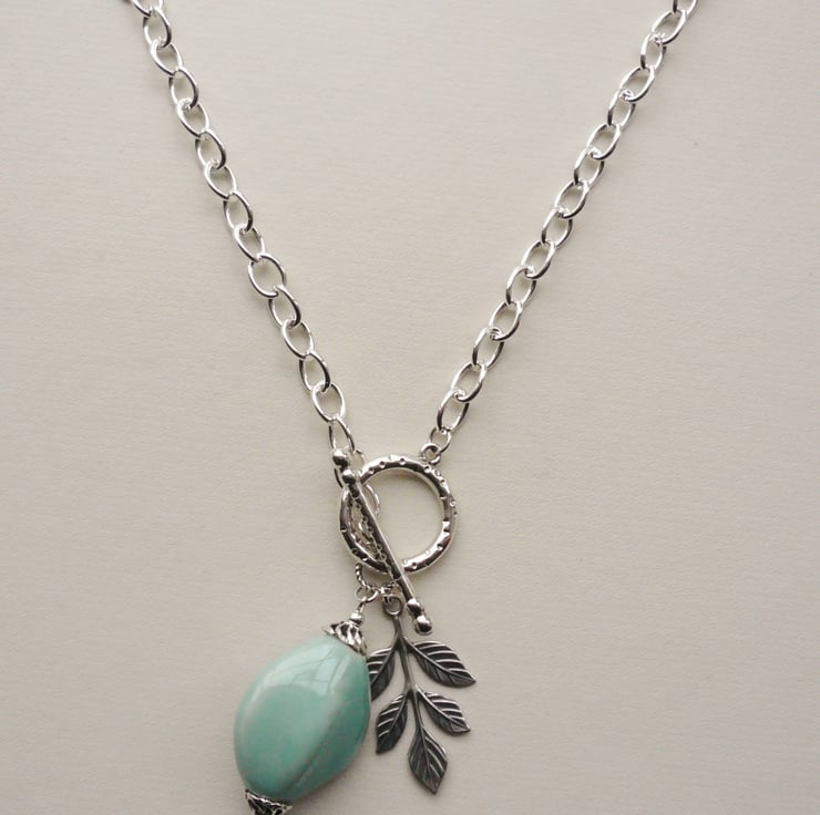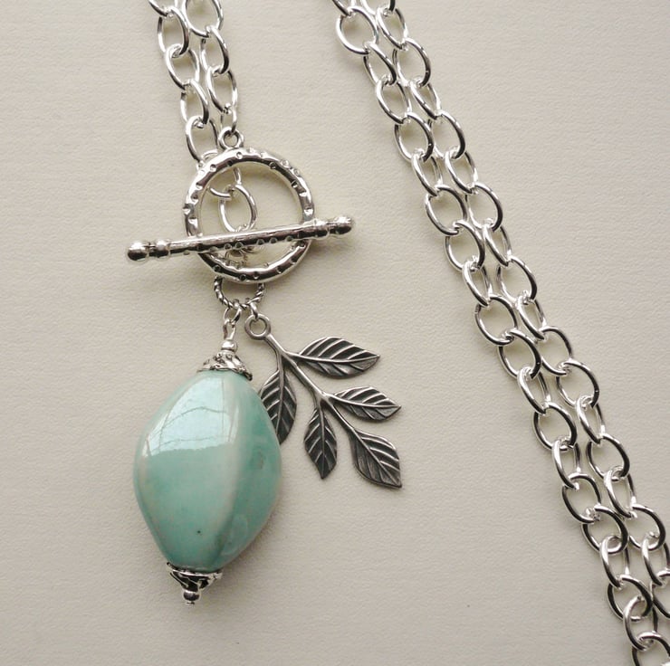 This long necklace consists of a 30mm long pale turquoise ceramic 4-sided oval bead and 35mm silver plated leaf pendant charm. Bead caps, spacers etc are silver plated as are the chain and front fastening toggle clasp. Total length incl clasp is approx 75cm.