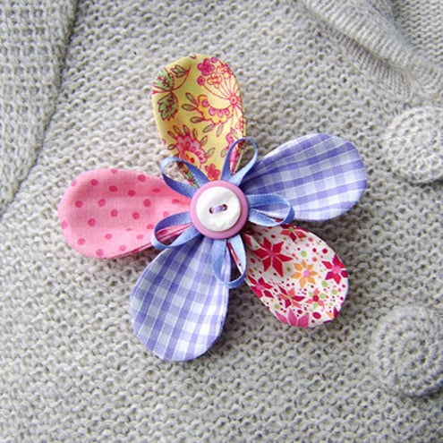 This flower brooch is made from individual cotton print and gingham petals in bright pastel shades. It is finished with a lovely ribbon detail and double vintage button centre. There is a metal brooch pin on the reverse side for easy attachment.