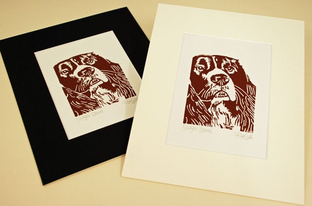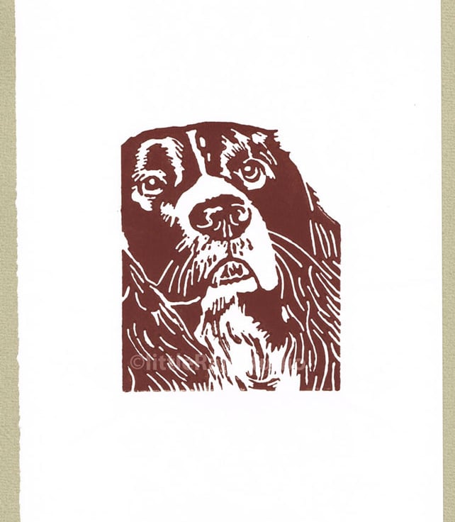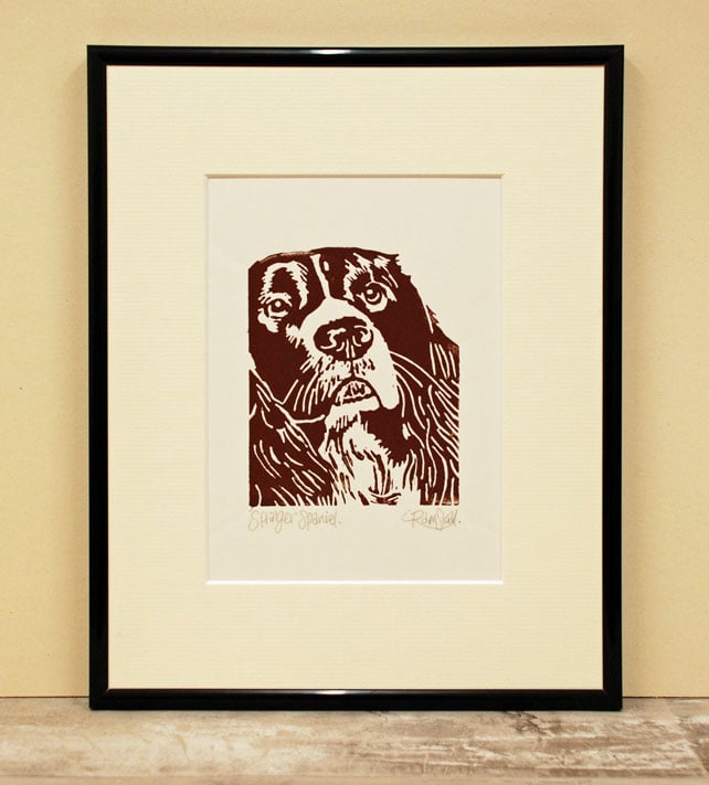 'Springer Spaniel Dog' - Original, hand pulled Linocut Print, printed on hand press in rich brown ink. Signed and titled in pencil by the artist.