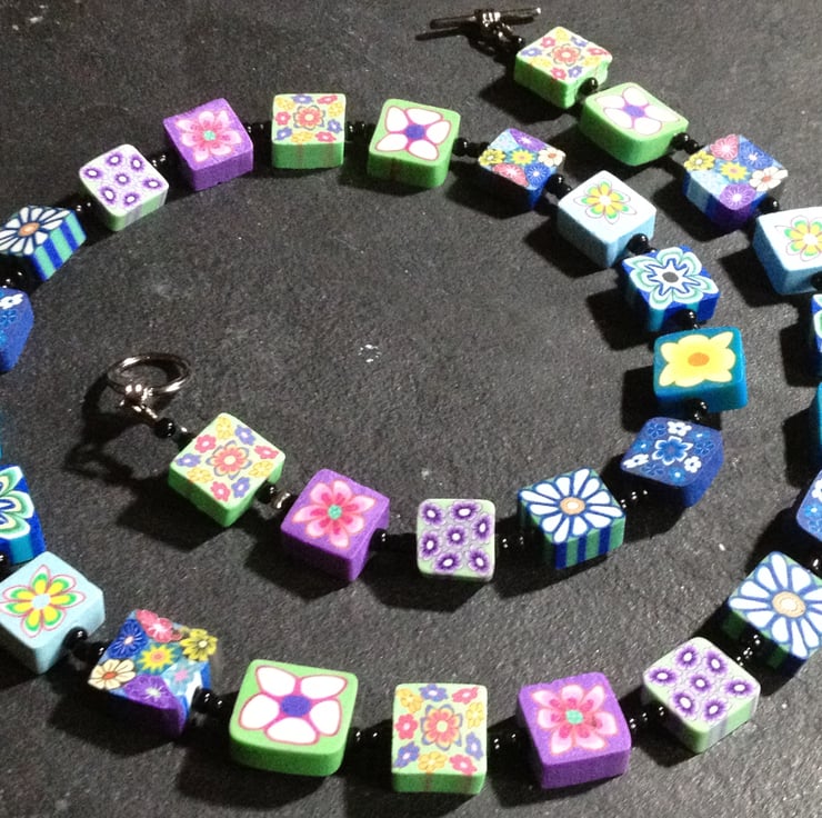 A vivid design featuring a variety of brightly coloured square floral canes in graduated shades of blues, greens and purples off-set to dramatic effect with the simplest black seed beads and high quality black metal jewellery findings.