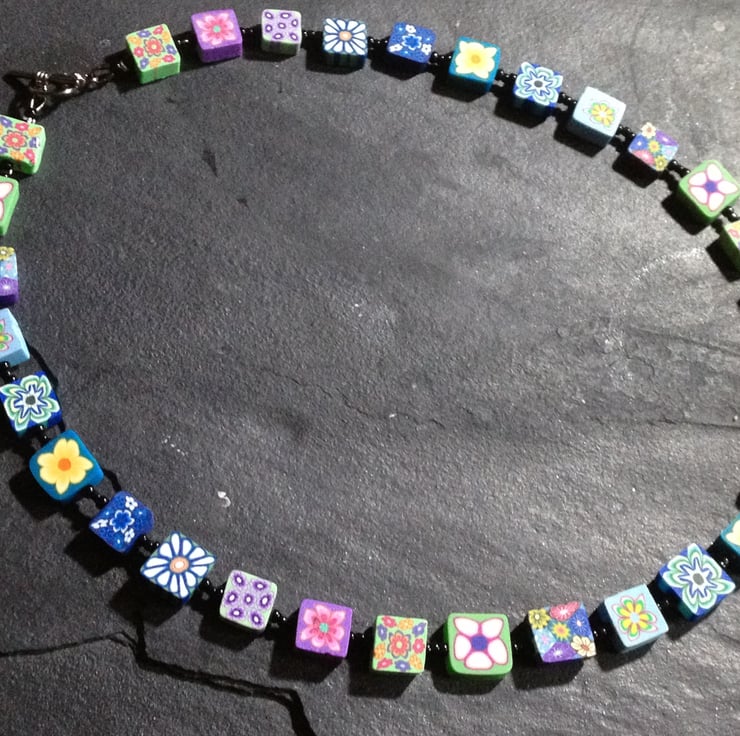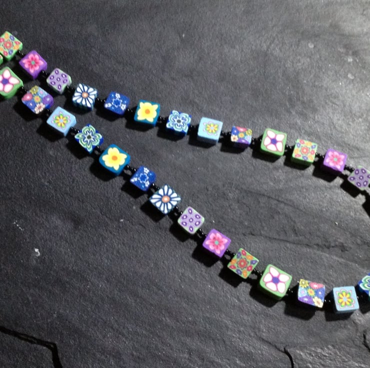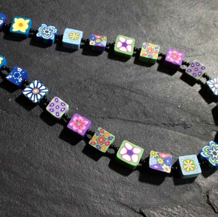 The unique selection of square floral canes used in this design means that each of these necklaces will be a one-of-a kind creation full of vibrant colour and bound to attract attention! Yours will be highly similar to the one pictured, though not completely identical.