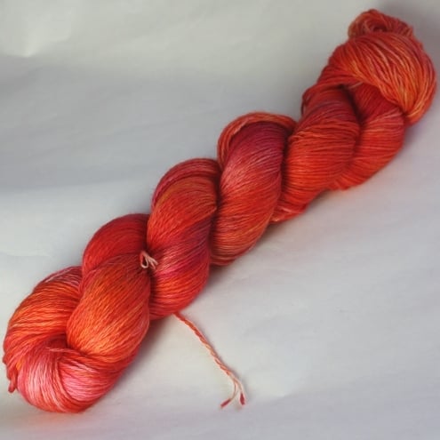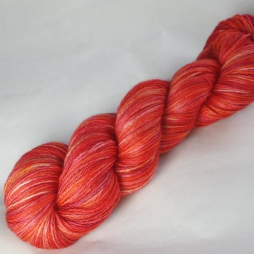 This skein reminds me of a sunset in a fantasy-art poster, with its vivid reds and oranges with a few lighter flashes. This soft