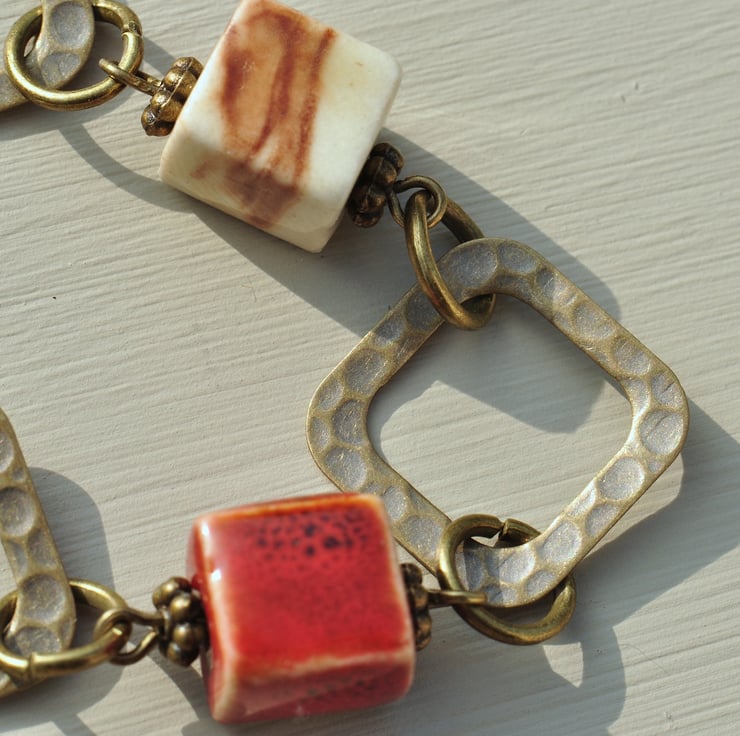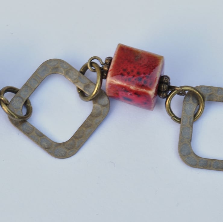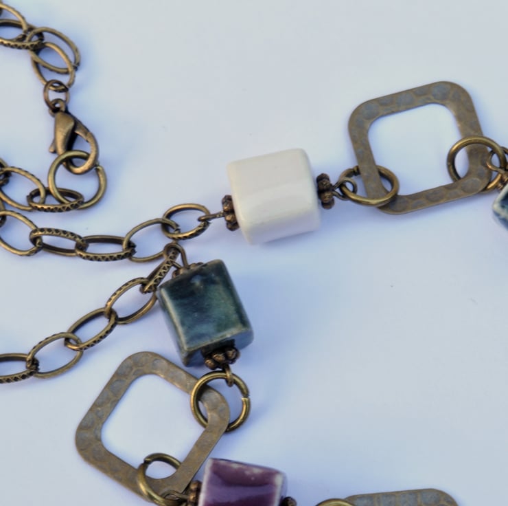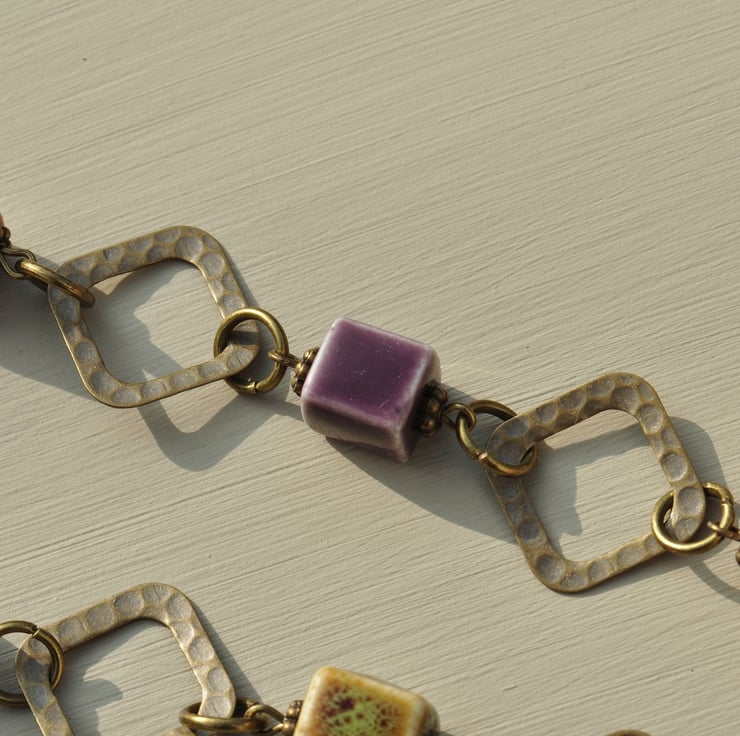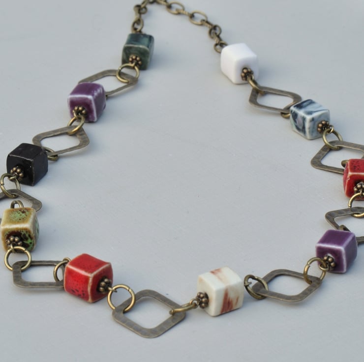 A lovely mix of ceramic cube beads are the main focal of this necklace in shades of purple, red, cream, white, green and brown, each having lovely unique qualities with little antique bronze plated spacer beads and in between lovely antique bronze plated diamond shaped connectors and finished with textured chain with trigger clasp.