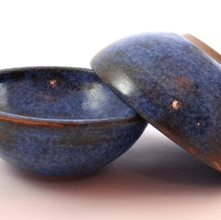 The glaze is particularly eye-catching - a lovely mottled almost mauve-to mid-blue with areas where the surface took on hues that range from moss to terracotta. The photos very much capture their actual appearance.