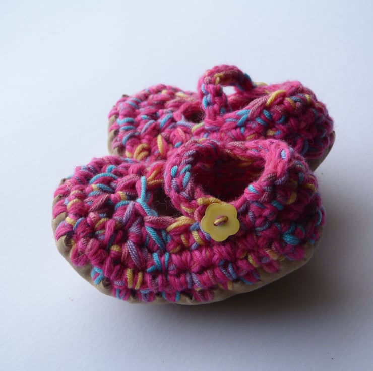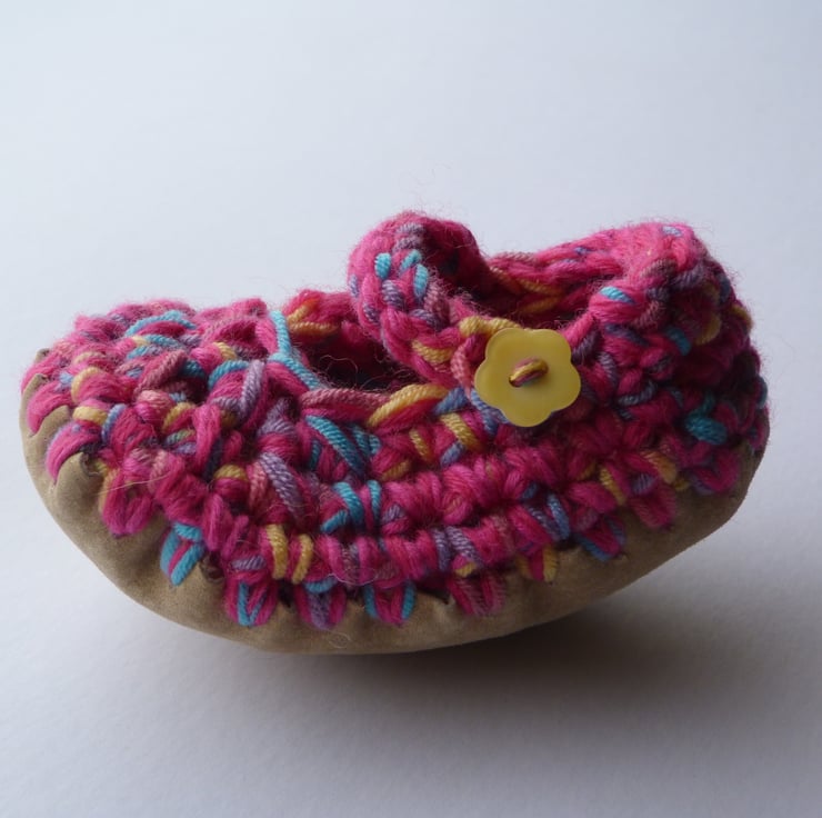 These adorable little shoes will keep your baby's feet snug and warm and add a dash of colour to any outfit! Soft chunky fabric with stretch for comfort and growing room and non- slip soft suede sole. A perfect gift for a baby girl.