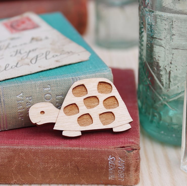 This wooden turtle brooch has been laser cut from 3mm birch plywood and is glued securely to a silver plated brooch bar. The turtle has been coated in wood oil to protect the wood and give it a beautiful finish. The wood comes from a natural source and is FSC certified meaning it's environmentally friendly!
