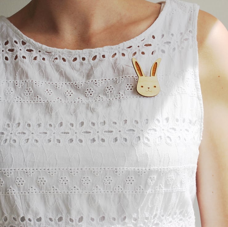 This wooden bunny rabbit brooch has been laser cut from 3mm birch plywood. It is glued securely to a silver plated brooch bar and has been coated in wood oil to protect the wood and give it a beautiful finish. The wood comes from a natural source and is FSC certified meaning it's environmentally friendly.