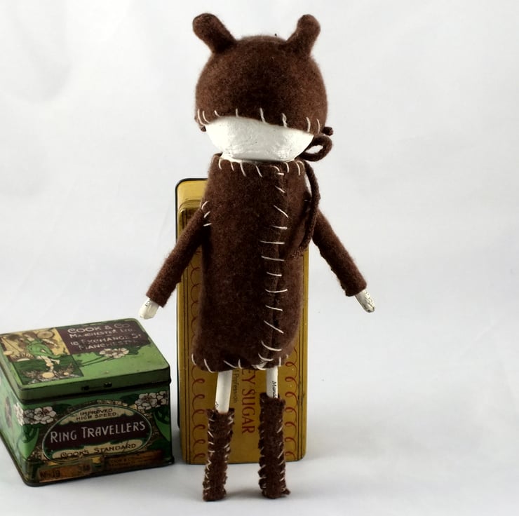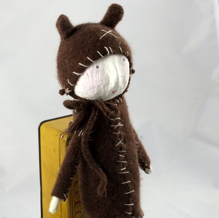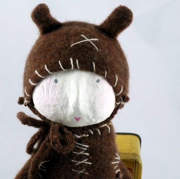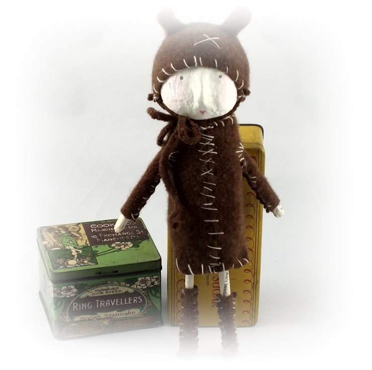 Her teddy suit is made from boiled lambswool and has been randomly stitched with vintage darning wool.