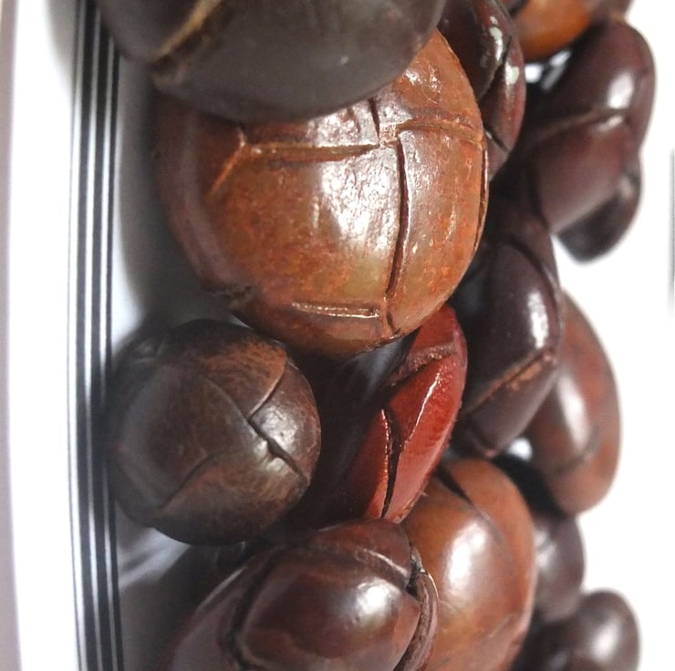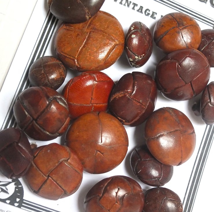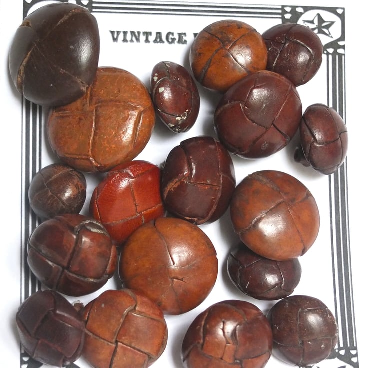 18 Vintage Brown Leather 'Football' Buttons all different sizes and ages, and shades of brown, all have a leather stand on back!