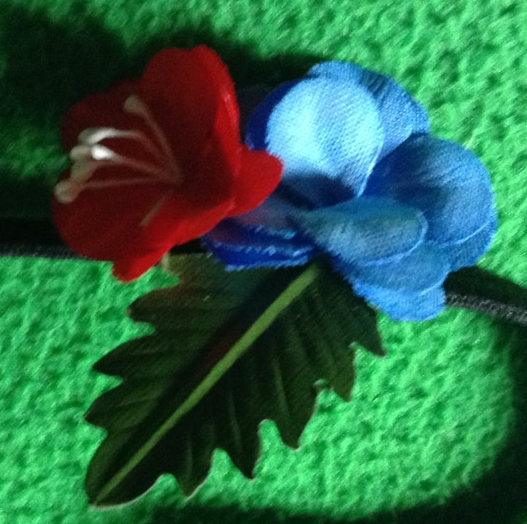The shiny green leaf is about 4 c.m. long, the blue flower is about 2.5 c.m. in diameter and the red flower about 2 c.m. in diameter.