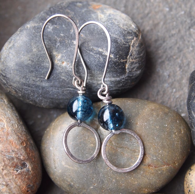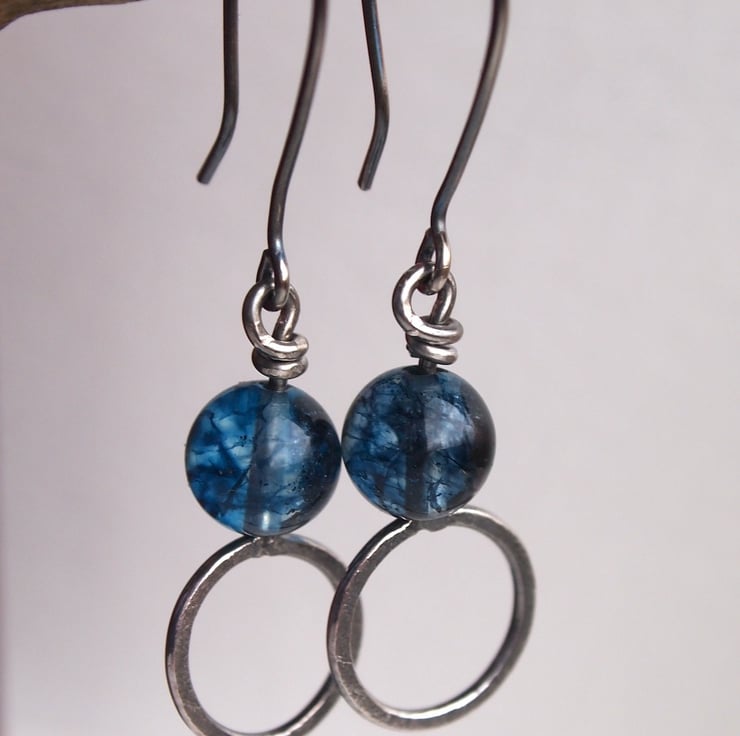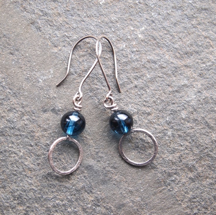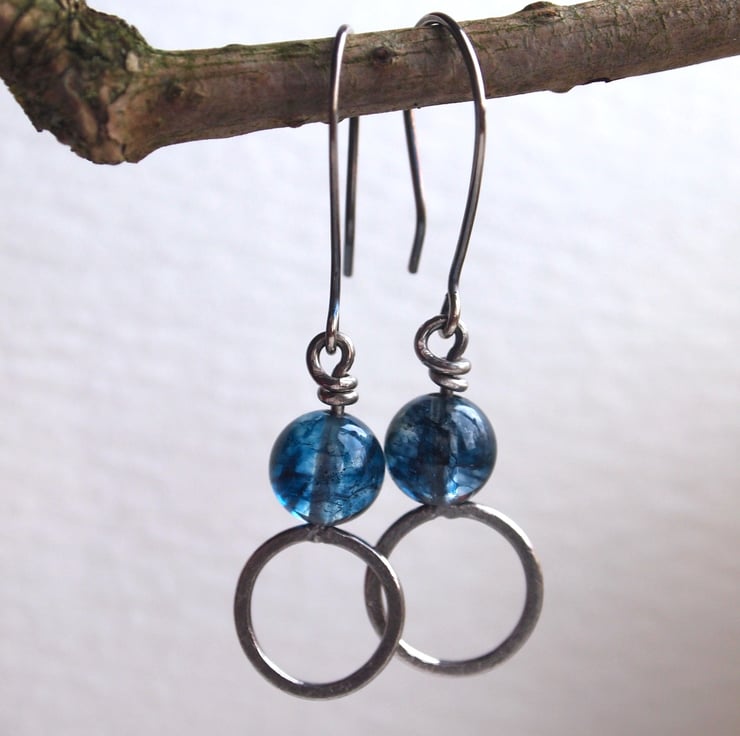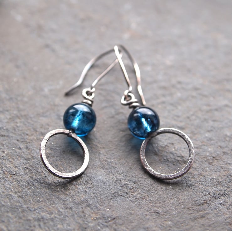 These handmade sterling silver dangly earrings have a ring of textured silver with a blue tinted crystal bead sitting above. A twist of silver secures them to handmade sterling silver ear wires.