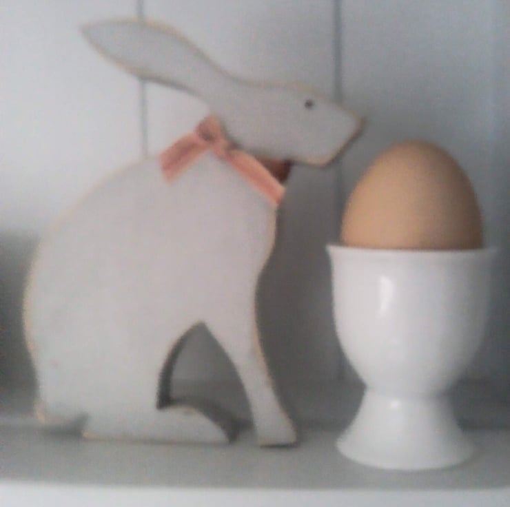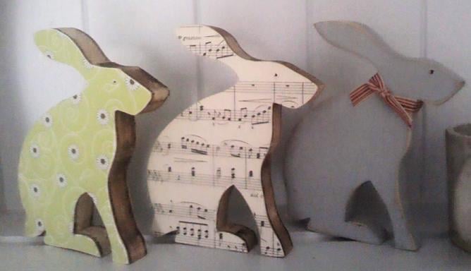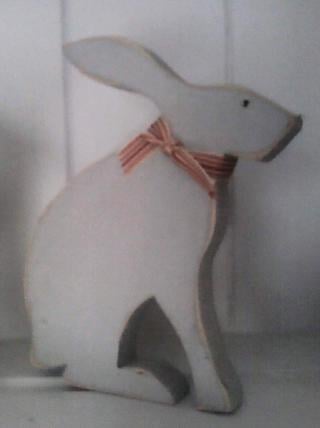 A freestanding wooden Hare made by hand in the Scottish Borders, all individually hand drawn, cut by a band saw and sanded, painted, sanded, painted and then sanded again to give a distressed look. A little ribbon is added to finish this little fella off!"
