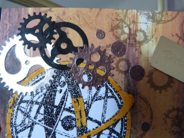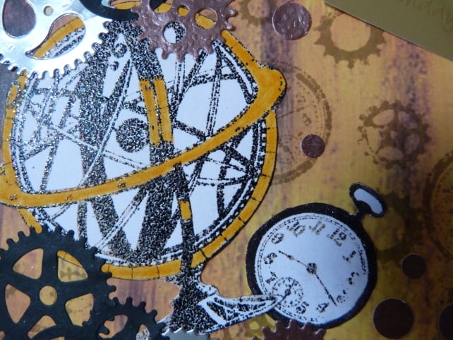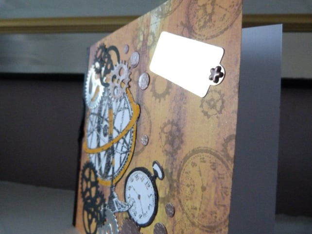 Assorted timepieces and cogs die cut from black, gold and copper coloured card, mounted onto orange paper which has had cogs and clocks stamped onto it, and then mounted onto quality white textured card. Finished off with a happy birthday topper in black glittered card and edged with black textured ribbon and bow.