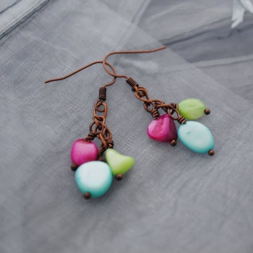 These antique copper earrings have hand-wrapped rivershell beads in turquoise, fuchsia and green