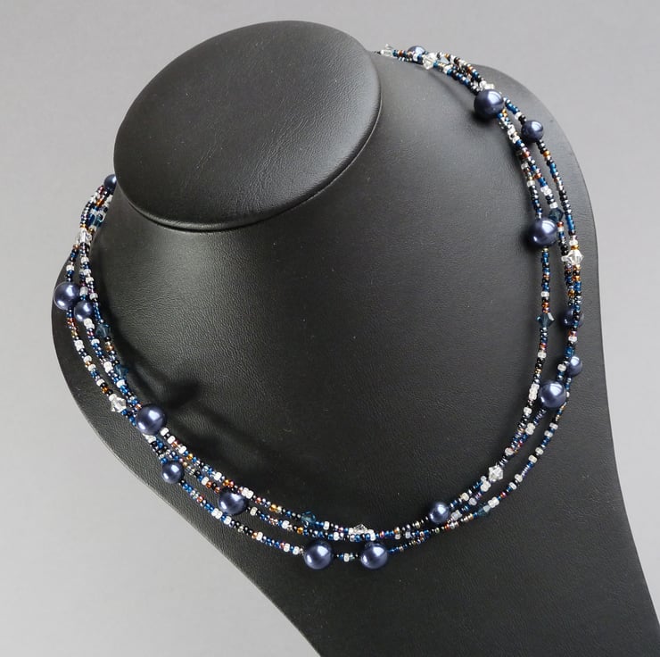 This navy blue, multi-tonal necklace has been created using dark blue glass pearls, sparkling crystals and Czech glass seed beads. Colours featured in this multi-strand necklace include midnight blue, white, black and grey. Unlike a lot of multi-strand necklaces, this three strand necklace is braided to ensure the strands sit well when worn.