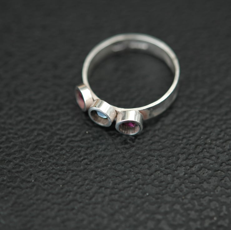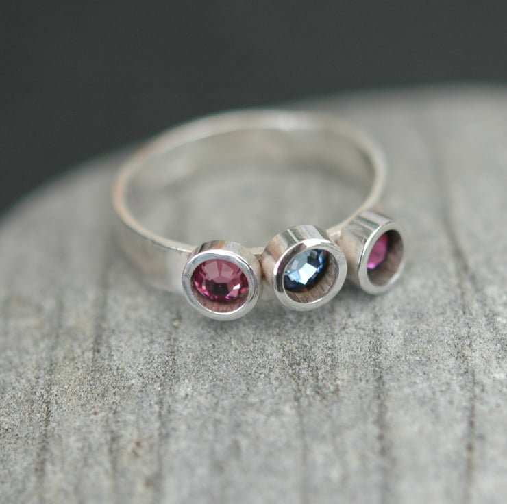 This ring is made from 4mm wide rectangular wire and has three 4mm Swarovski crystals securely embedded in tube settings which are soldered to the surface. The ring is highly polished and is shown with sapphire blue and fuchsia crystals.