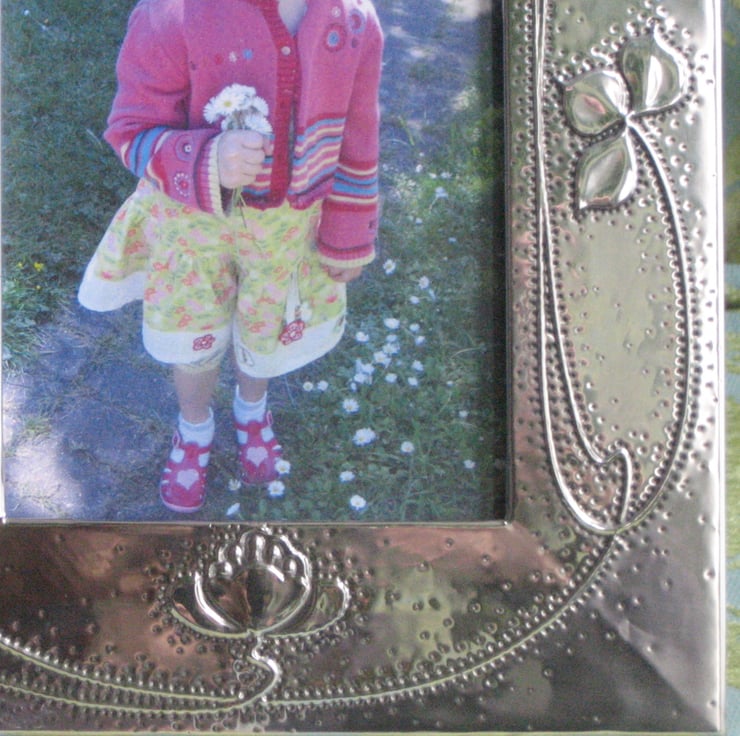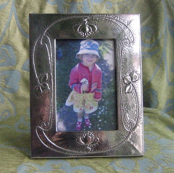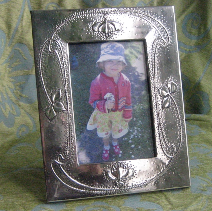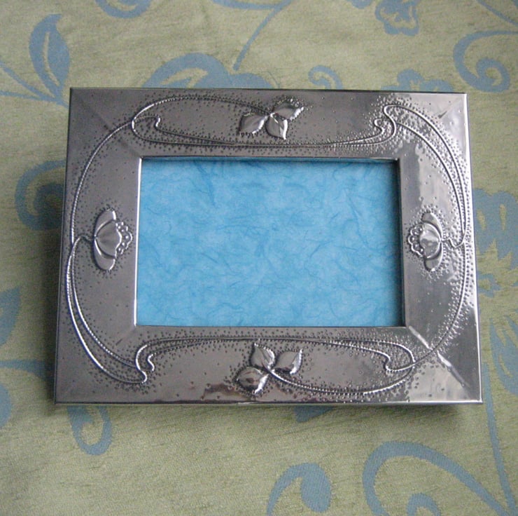 This striking frame has been hand-made in shiny modern pewter in an asymmetrical Art Nouveau style, and can be used for a landscape or portrait photograph. Measuring 173 x 220mm overall, it will take a 4 x 6 inch photograph. The reverse, which is covered in dark blue velour, has a stand and two rings for hanging in either position. A perfect gift for a 10th Wedding Anniversary, Wedding, Birthday or any other special occasion.