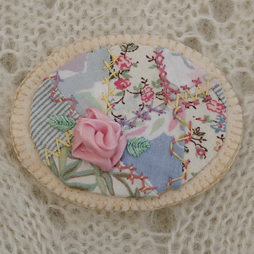 A traditional crazy patchwork in miniature. Stitched from coordinating fabrics in pastel shades. Fabric seams are embellished with embroidery stitches and further interest is added by the inclusion of the rose.