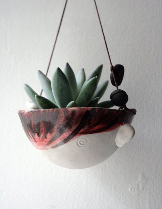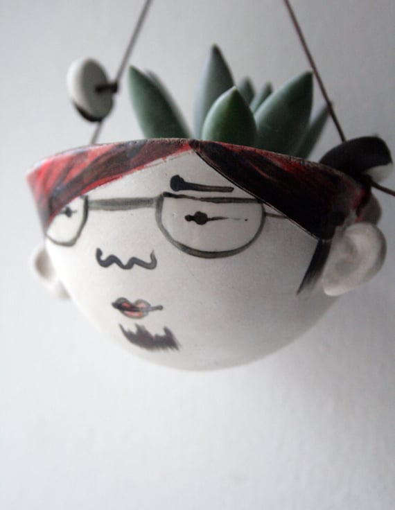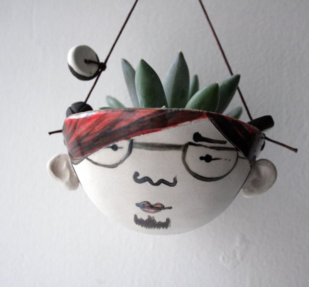 A hand formed stoneware planter with hand painted character.