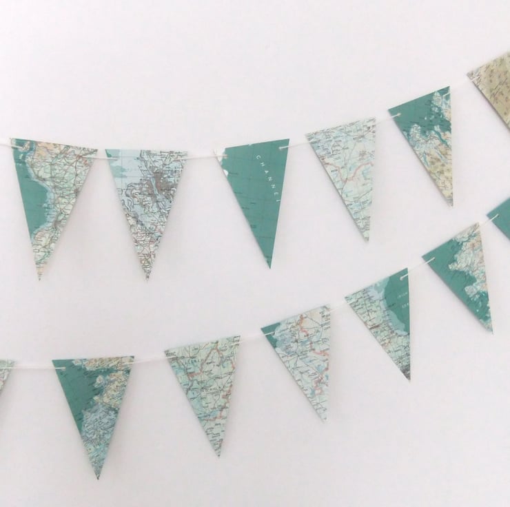 This eco-friendly garland was designed to be viewed from one side only. There are also maps on the other side but they may be upside down or on their side (though this is probably only noticeable if someone is carefully studying the bunting!!